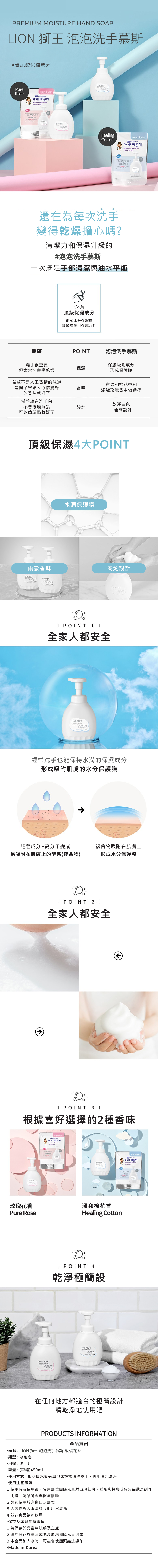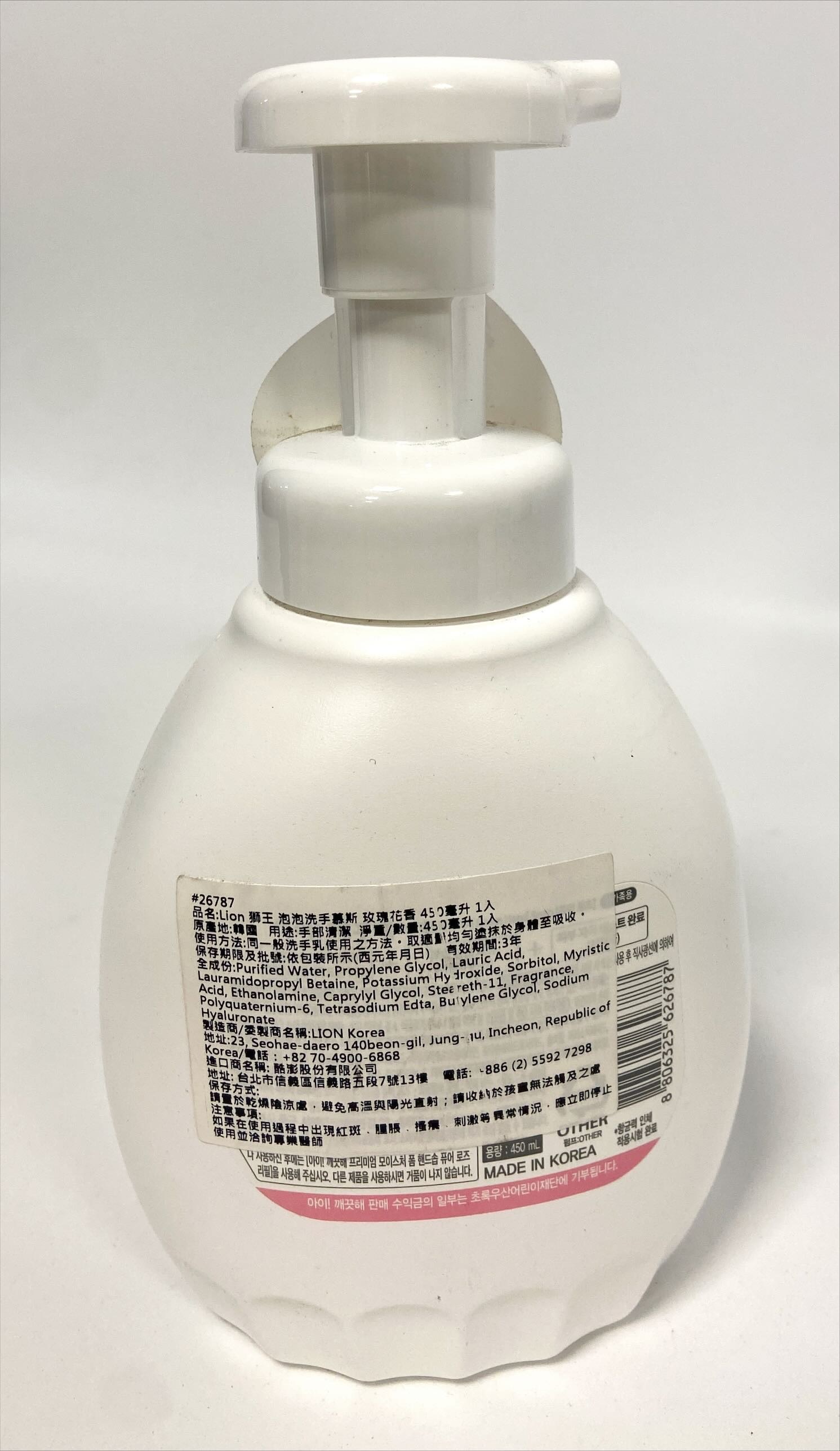 韓國販售同款 LION 獅王泡泡洗手慕斯,玫瑰花香,給您帶來溫和潔淨的體驗。這款慕斯質地細膩,能深入毛孔,有效去除污垢和細菌,同時保持雙手肌膚的滋潤。玫瑰花香氛清新怡人,讓洗手過程更加愉悅。450ml大容量設計,適合全家使用。經皮膚測試,溫和配方,不刺激肌膚,讓您和家人安心使用,遠離細菌侵擾,呵護手部健康。