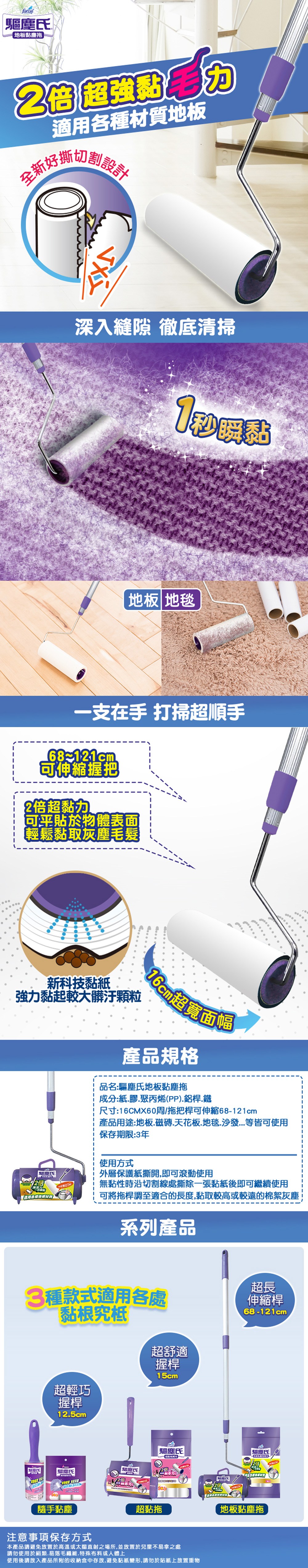 告別彎腰打掃的煩惱,驅塵氏地板黏塵拖讓清潔變得輕鬆又高效!這款家庭用黏塵拖配有16公分寬的黏塵紙,每卷60周,搭配可伸縮拖把桿,長度從68公分到121公分可調,無論是地板、磁磚還是天花板,都能輕鬆應對。黏塵紙採用特殊技術,能有效黏起灰塵、毛髮及較大髒污顆粒,讓地面一塵不染。可伸縮的拖把桿設計,方便您根據需要調整長度,輕鬆清潔高處或低處,省時省力。使用後,只需撕掉髒污的黏塵紙即可,方便快捷,是您居家清潔的好幫手。