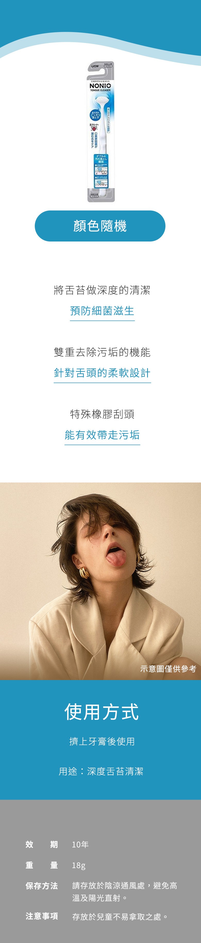 - 柔軟刷毛設計,溫和清潔舌苔,減少不適感,讓口氣清新宜人。