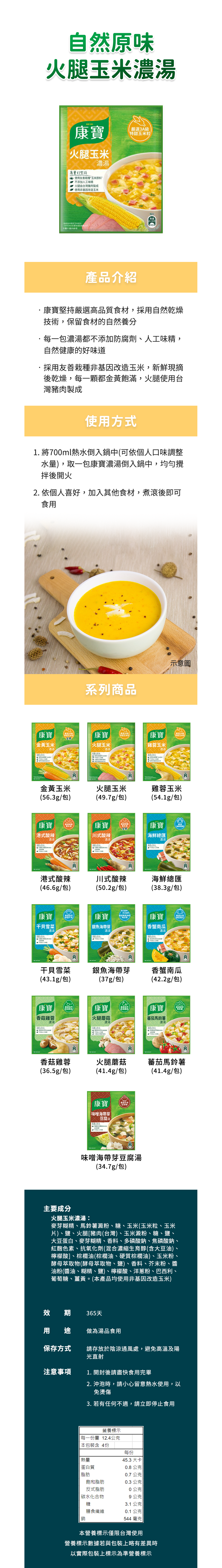 - 嚴選3A級特甜玉米粒,搭配台灣豬肉製成的火腿,湯頭濃郁滑順,口感豐富有層次,給您帶來滿足感。
