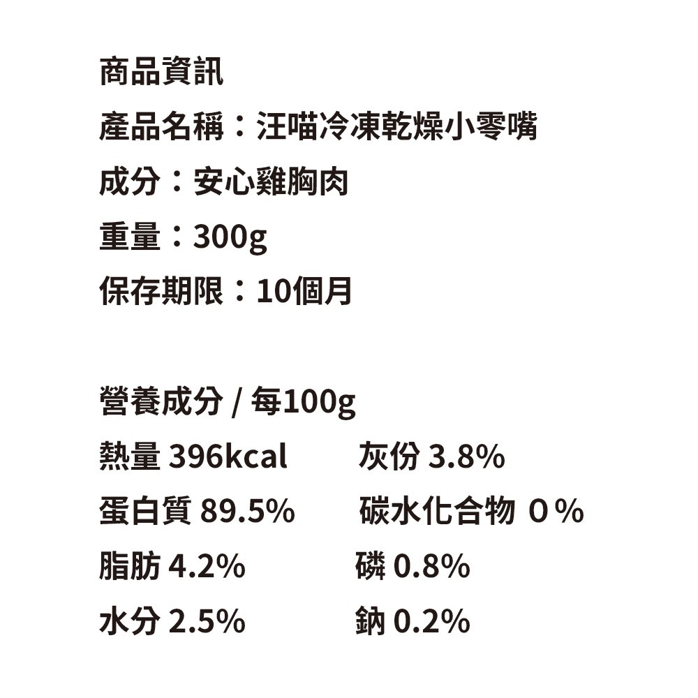 - 嚴選安心雞胸肉,提供豐富蛋白質,幫助犬貓維持肌肉健康,活力充沛,讓牠們健康成長。
