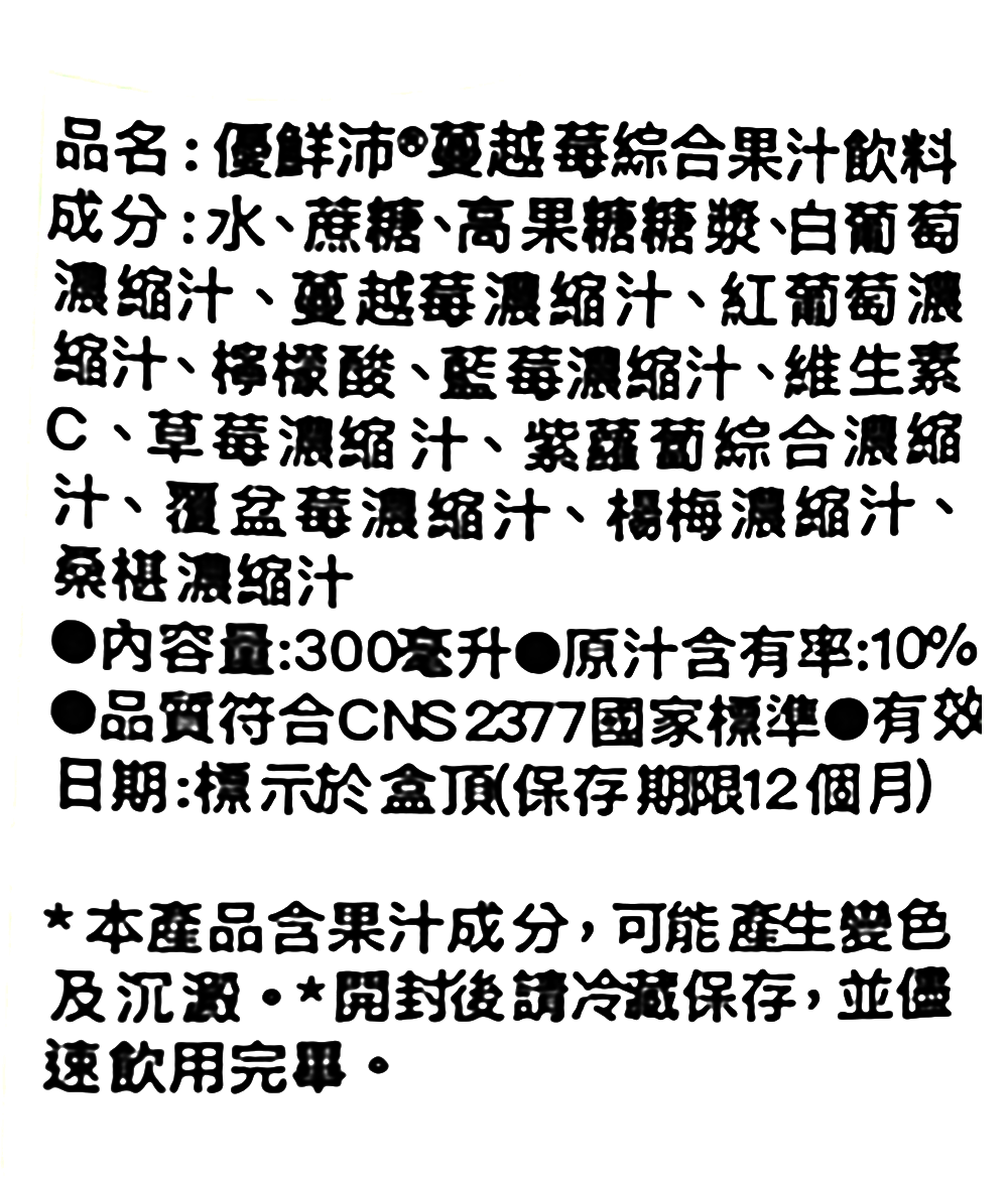 - 蔓越莓綜合果汁富含多種水果風味,酸甜適中,口感豐富,給您帶來多層次的味蕾享受。