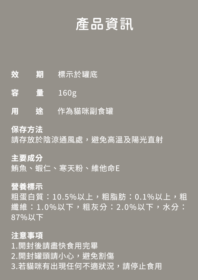 - 160克大份量設計,適合多貓家庭或食量大的貓咪,一次餵飽多隻愛貓,省時省力更方便。