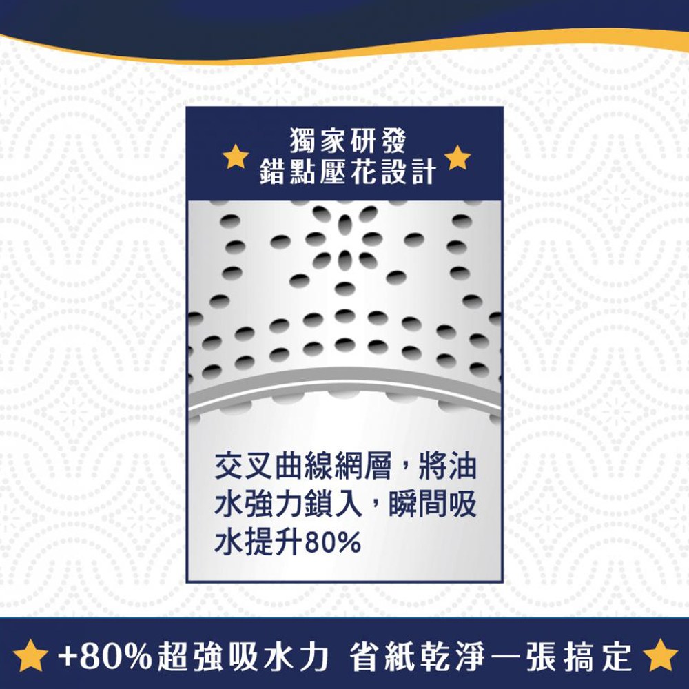 - 採用獨特壓花技術,增加紙巾的厚實度,提升吸水力,使用更省。
