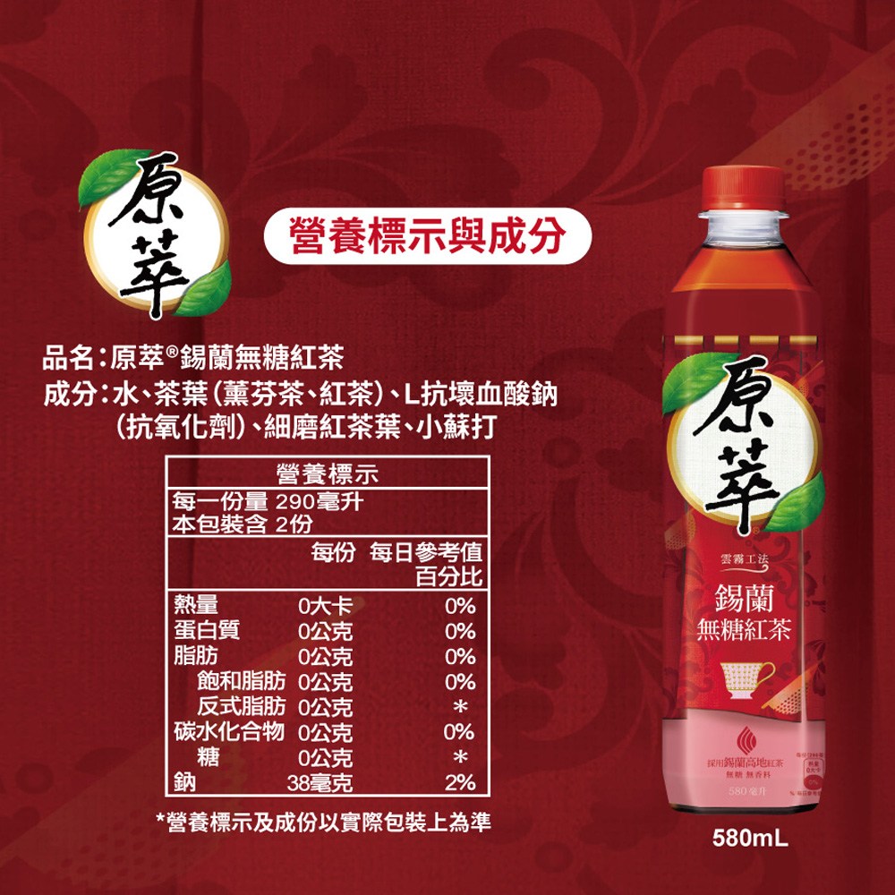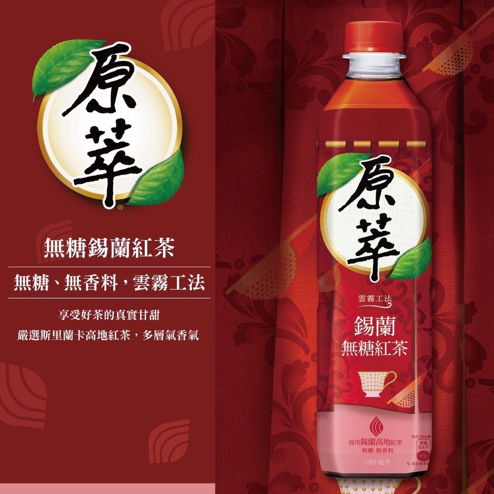 暢飲[箱裝]原萃 錫蘭無糖紅茶,一次購足24瓶580ml的份量,隨時享受來自錫蘭的純正風味。嚴選錫蘭高地紅茶,以獨特雲霧工法萃取,口感層次豐富且甘甜,無糖、無香料,讓您享受無負擔的真實茶味。原萃為台灣無糖茶領導品牌,品質嚴格把關,讓您買得安心。無論是辦公室常備、家庭聚會,或是外出旅行,箱裝原萃錫蘭無糖紅茶都是您的最佳選擇。