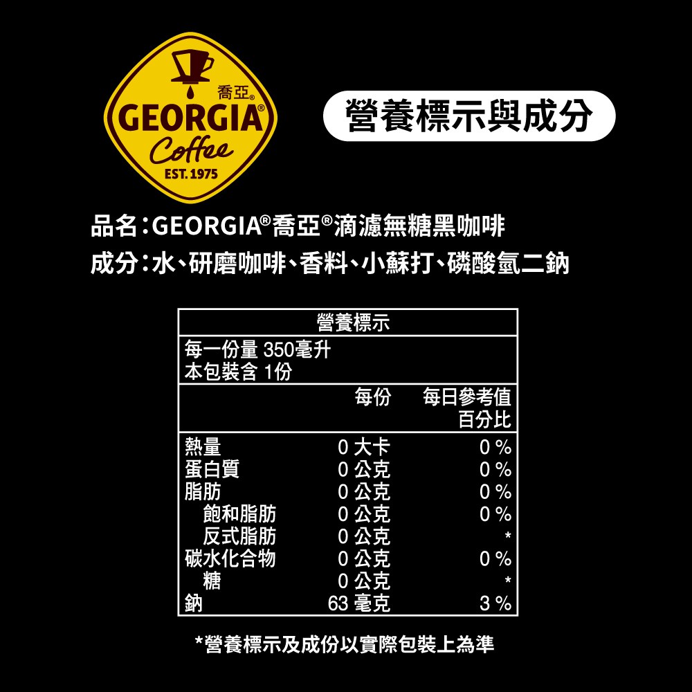 喬亞 阿拉比卡無糖黑咖啡,是您隨時隨地享受純正黑咖啡的最佳選擇。這款瓶裝咖啡採用100%阿拉比卡咖啡豆,滴濾工法萃取,口感醇厚順滑,讓您彷彿置身手沖咖啡館。每瓶350ml,一箱24瓶,無論是辦公室提神、戶外休閒,或是與朋友分享,都非常方便。無糖配方,讓您享受咖啡的原始風味,無負擔。可放入保溫櫃中加熱,隨時享受溫暖的咖啡。