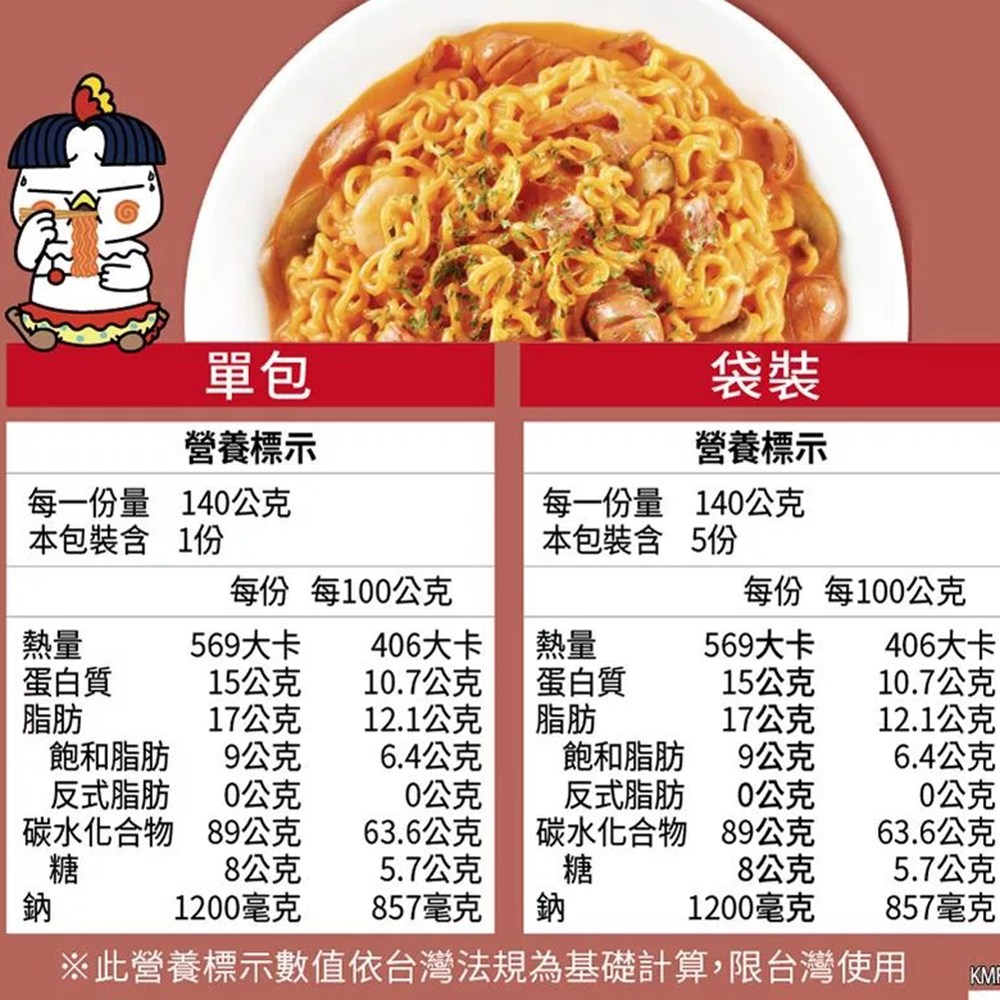 Buldak Ramen 火辣雞肉風味鐵板炒麵,粉紅醬風味,是韓國超人氣的道地風味!這款即食半調理食品,以其獨特的粉紅醬風味和火辣雞肉的完美結合而聞名。每袋包含5包,每包140g,讓您隨時隨地都能輕鬆享受美味。無論是快速午餐、宵夜,還是與朋友分享,都是絕佳選擇。請保存在室溫下,隨時享受這款令人難以抗拒的美味。