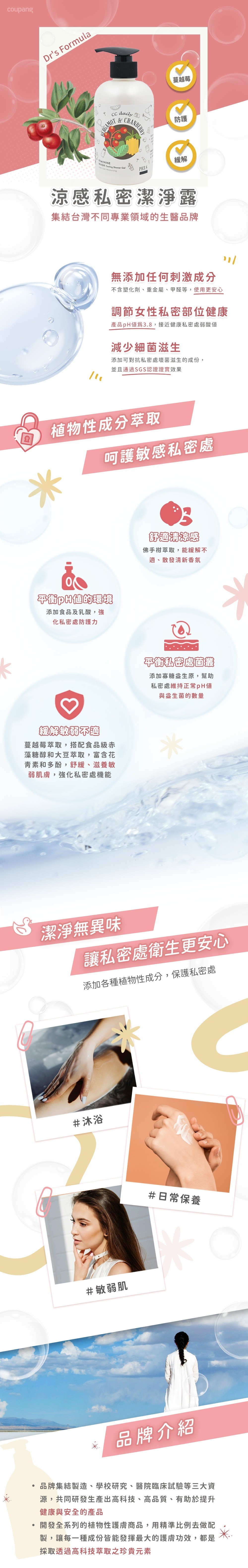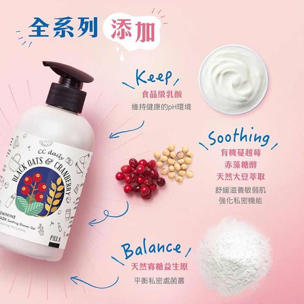 - 蔓越莓萃取有助於平衡私密肌膚的酸鹼值,維持健康舒適的環境。