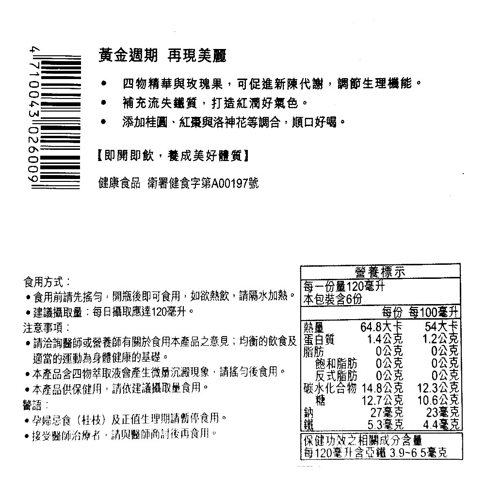 - - 玫瑰果萃取精華,天地合補四物飲能由內而外調整體質,讓您擁有健康美麗的自信。