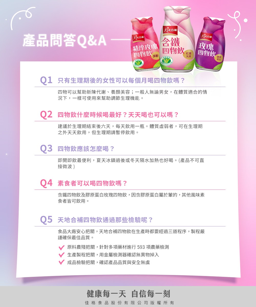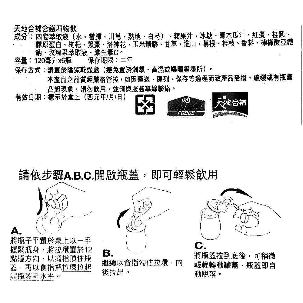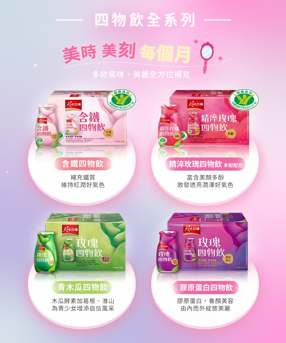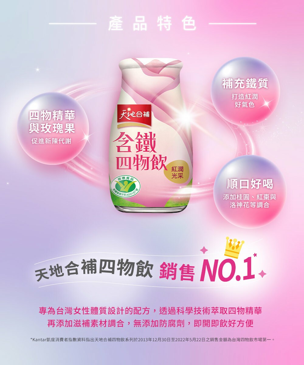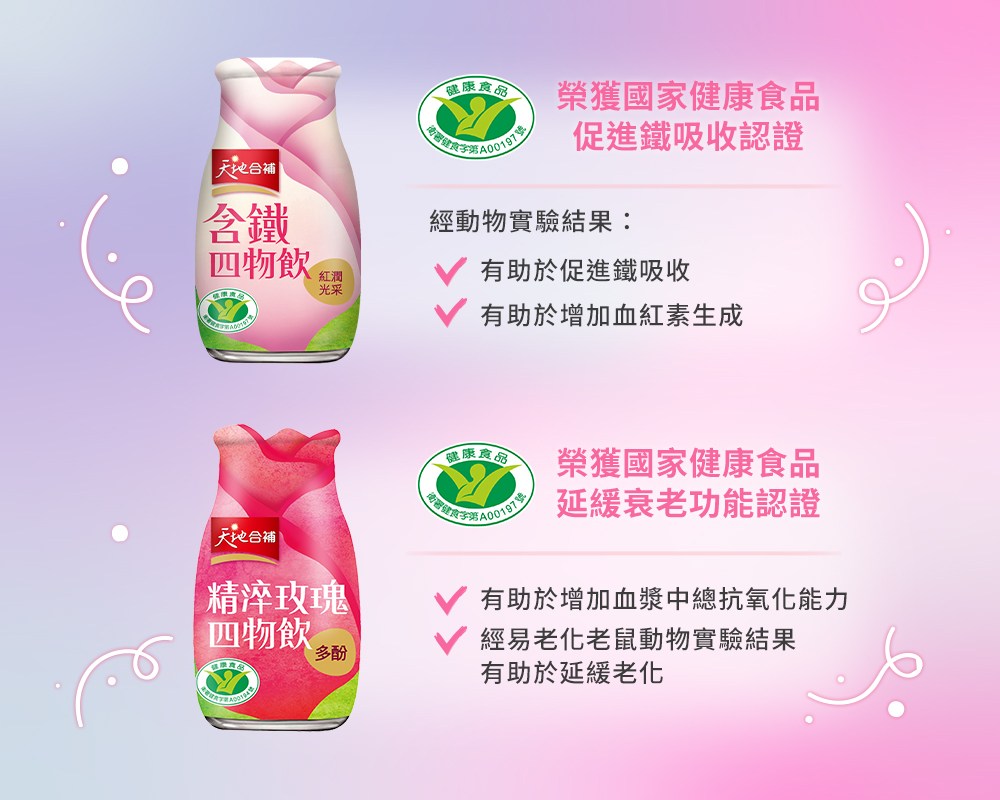 - - 天地合補四物飲,讓您隨時補充鐵質,告別虛弱,展現紅潤好氣色,美麗更加分。