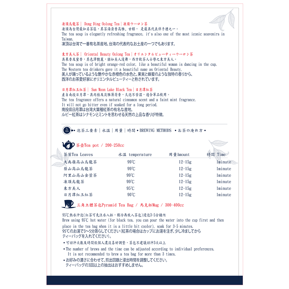 - - 臻選台灣名茶,一次品嚐四種獨特風味,感受不同茶葉的香氣與口感層次。