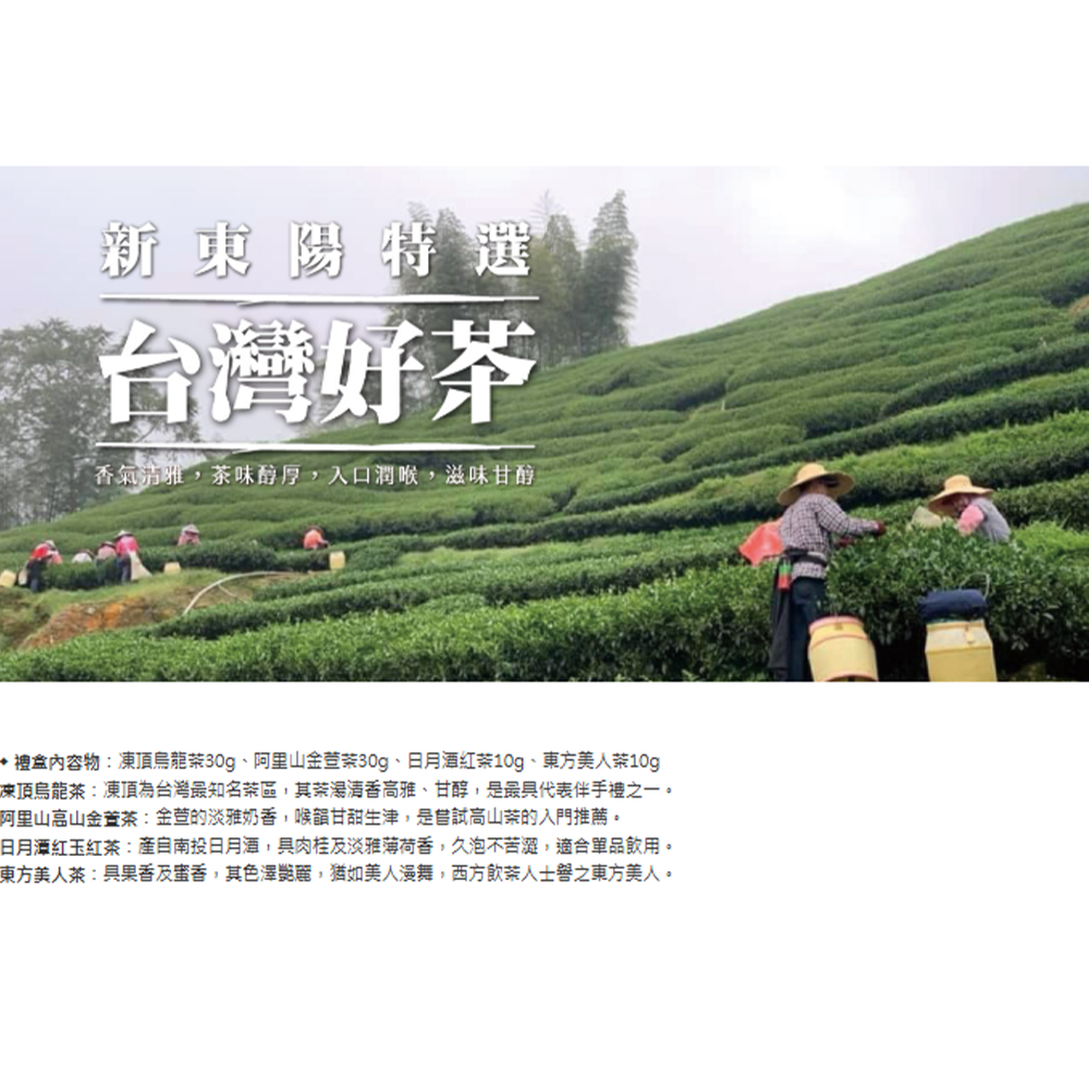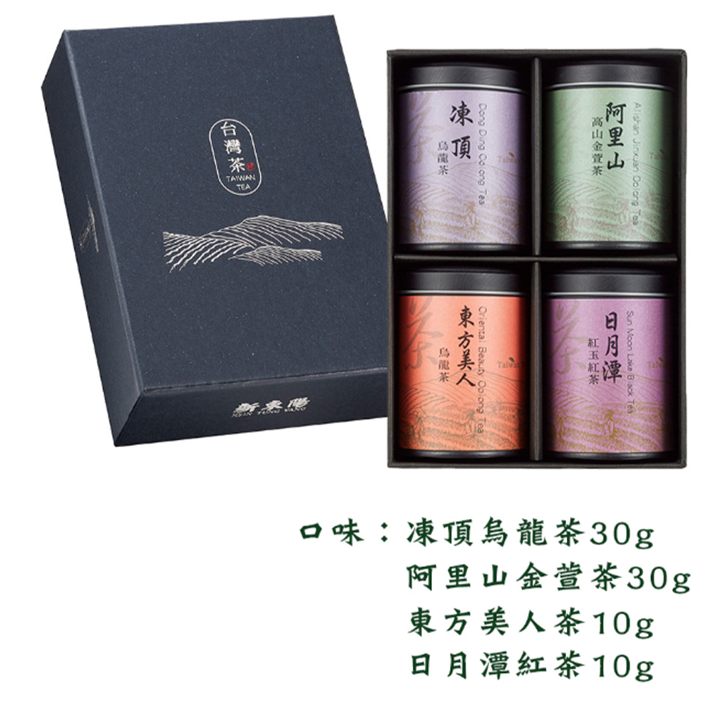 新東陽臻選台灣茶禮盒,匯集台灣四大名茶,讓您一次品嚐阿里山金萱茶的淡雅奶香、凍頂烏龍茶的甘醇、東方美人茶的蜜香、以及日月潭紅茶的肉桂薄荷香。此款禮盒包含30g凍頂烏龍茶與阿里山金萱茶各兩罐,以及10g東方美人茶與日月潭紅茶各兩罐,總重量80g。無論是自用或送禮,都能展現您的品味與心意。精緻的包裝設計,更添質感,是您體驗台灣茶文化的最佳選擇。