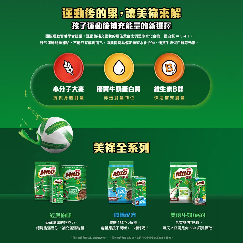 - 美祿減糖配方,享受濃郁巧克力麥芽風味,口感滑順,大人小孩都喜歡。