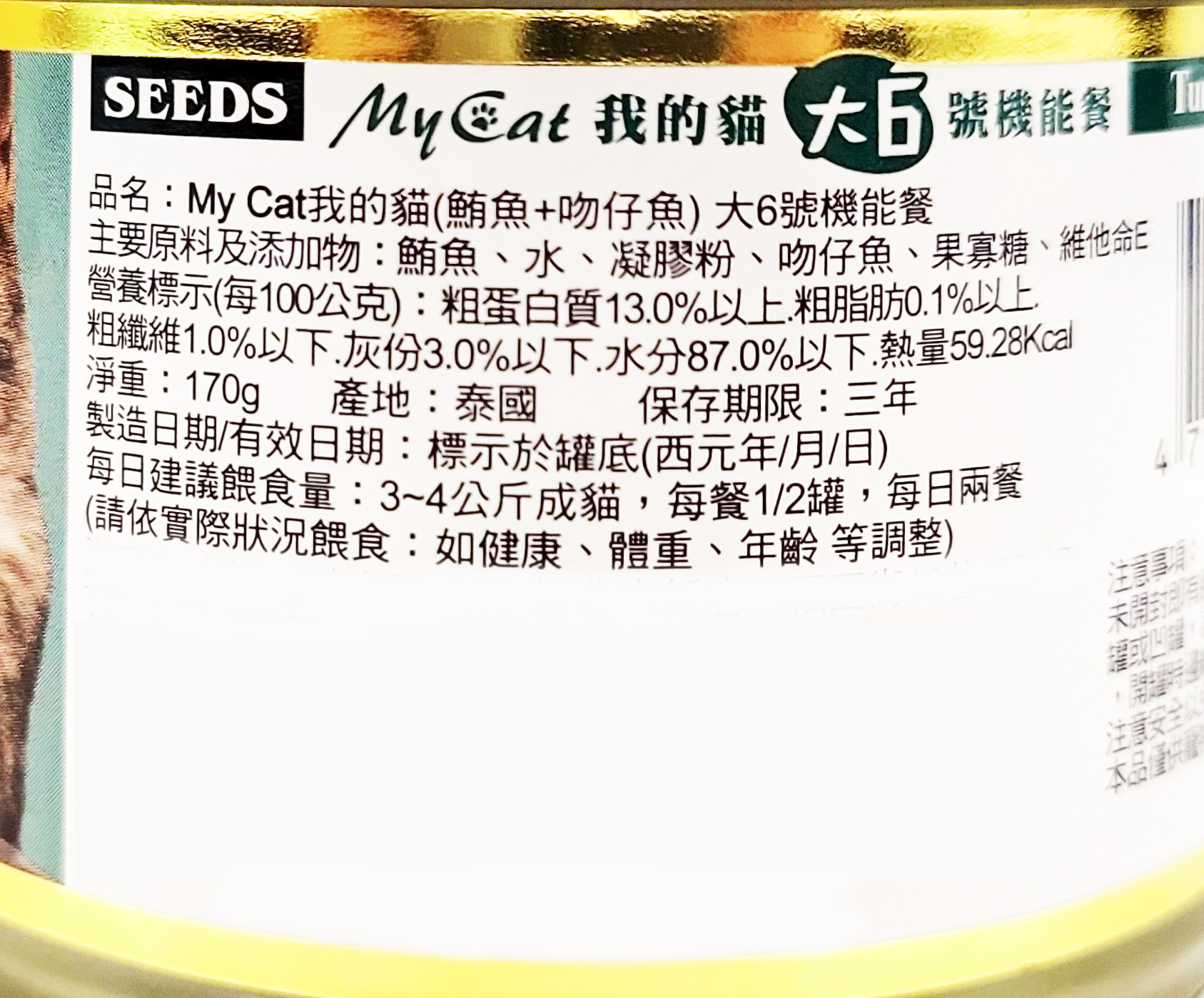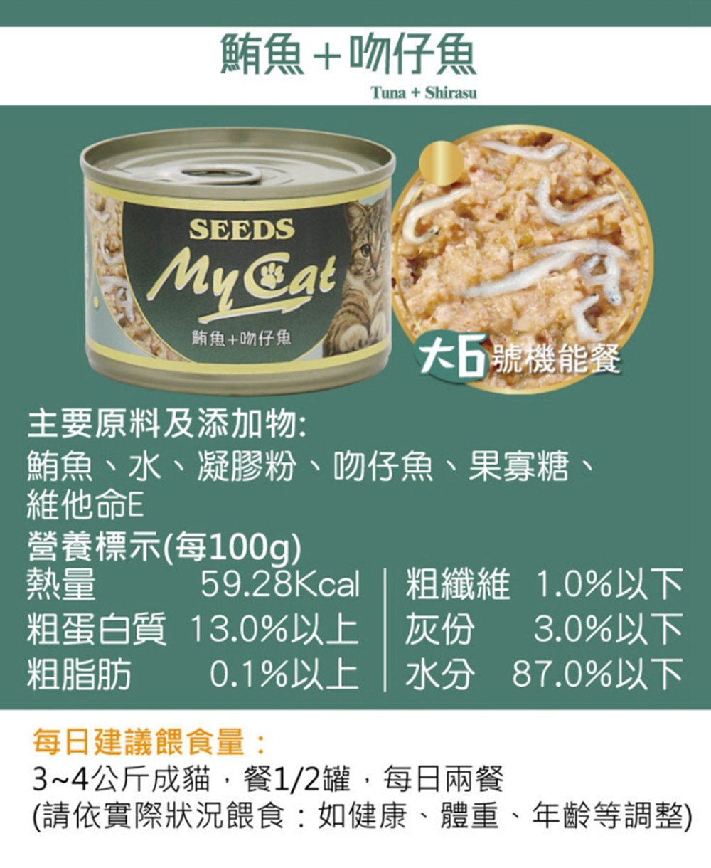 為您的愛貓提供營養豐富且美味的膳食!惜時 Seeds MyCat 大6號機能餐,選用優質鮪魚搭配鮮美吻仔魚,提供全齡貓所需的均衡營養。每罐170克的機能餐,富含必需胺基酸。此箱包含24罐,讓您一次購足,省時又方便。嚴選新鮮魚肉食材,給您的愛貓最安心的健康餐食。產地泰國,品質保證。