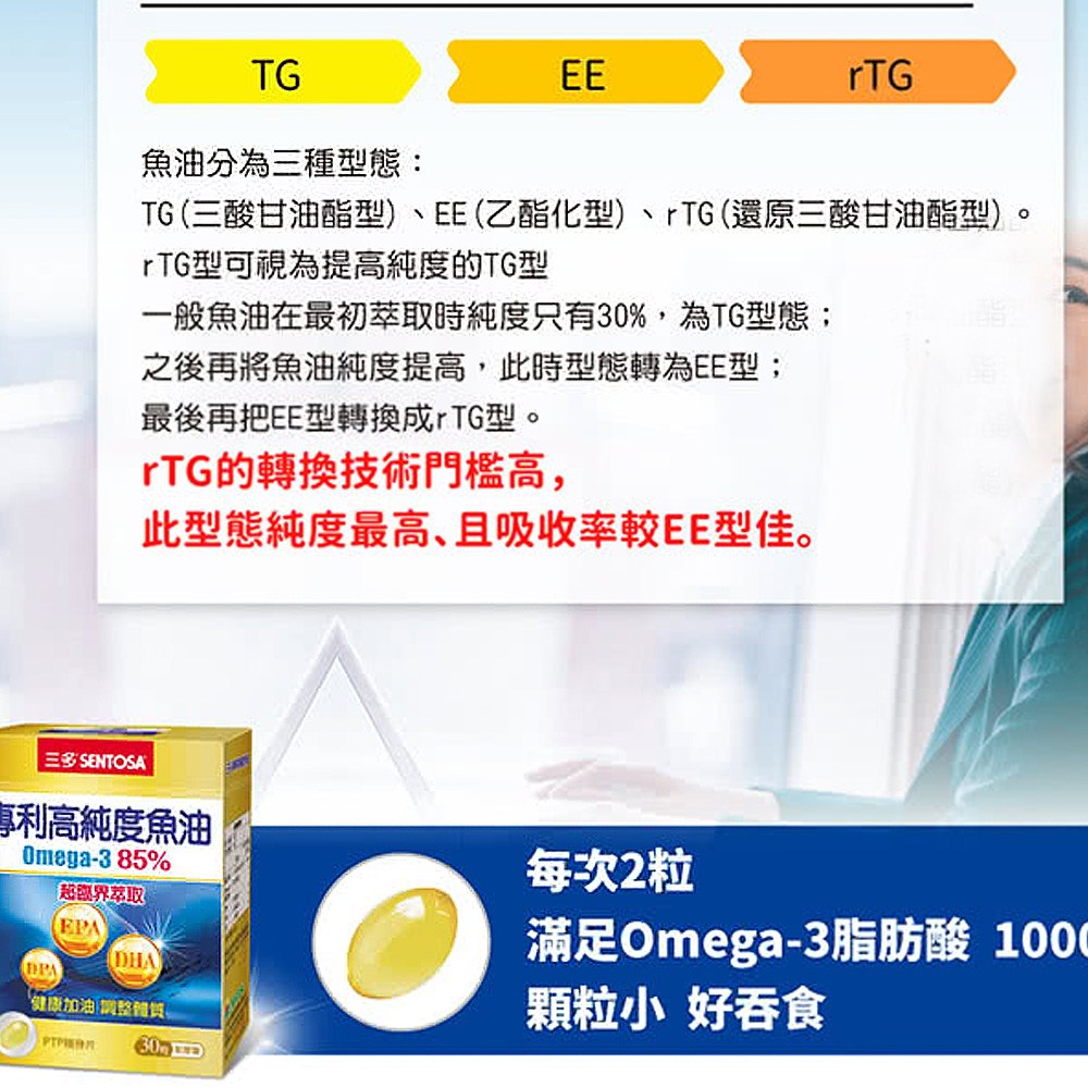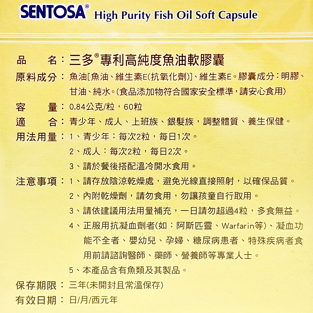 SENTOSA 三多專利高純度魚油,是您維持健康的理想選擇。每盒包含60顆軟膠囊,採用rTG形式,確保高純度Omega-3脂肪酸,有助於促進三高循環,讓您身體舒暢、思緒清晰。本產品嚴選沙丁魚、鯖魚等優質魚種,經專利技術萃取,去除魚腥味,口感更佳。每日輕鬆補充,為您的健康加分!適合成人通用,是您保健的最佳夥伴。