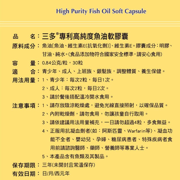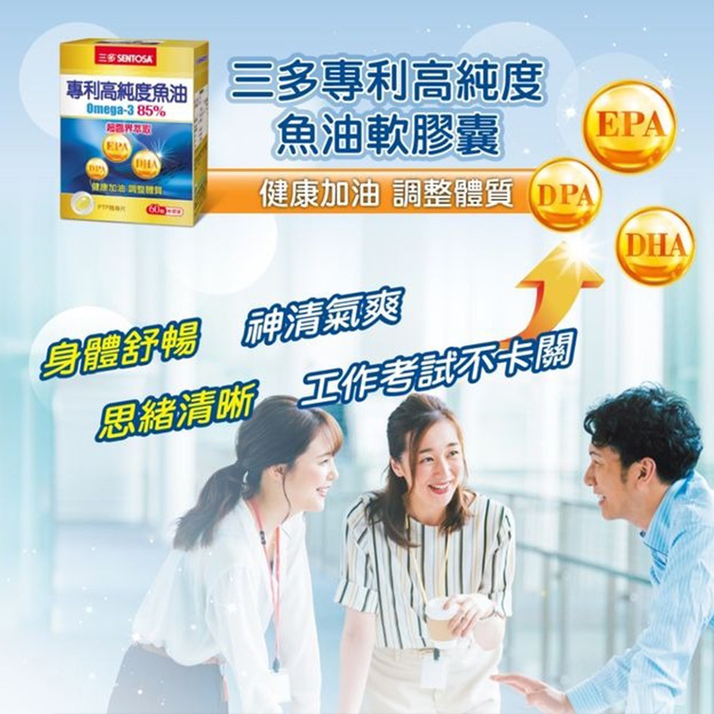 - 三多專利魚油提供身體所需Omega-3,讓您輕鬆補充每日營養,保持健康活力充沛。