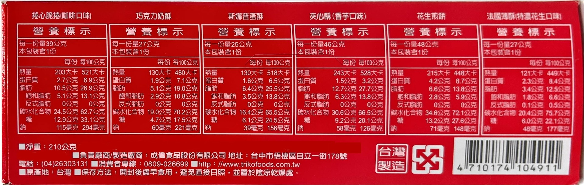 糕餅舖酥餅總匯,精選六種經典傳統酥餅,一次滿足您多重味蕾的渴望。內含咖啡捲心酥、巧克力奶酥、斯娜普蛋糕、香芋夾心酥、花生煎餅、特濃花生法國酥,每一口都是令人懷念的幸福滋味。獨立盒裝設計,方便攜帶與保存,無論是搭配咖啡、茶飲,或是與家人朋友分享,都是最佳的選擇。嚴選食材,品質保證,讓您安心享受美味。