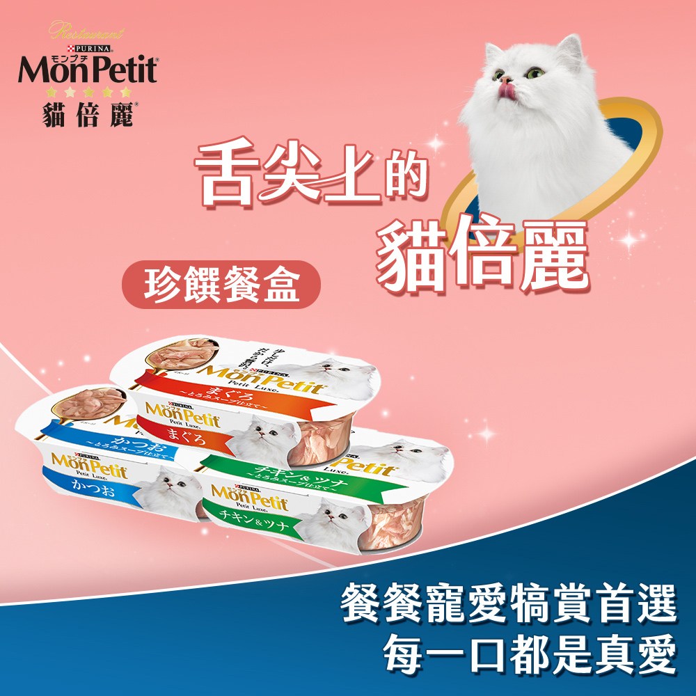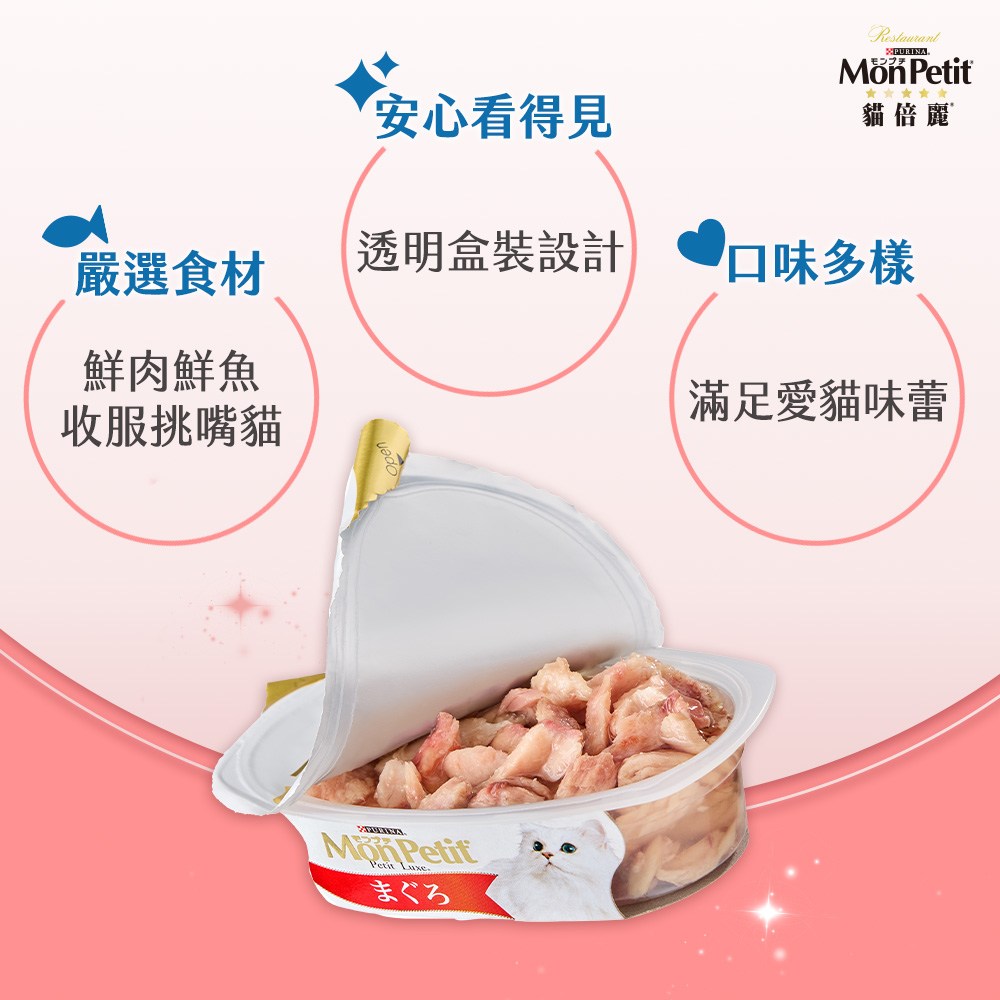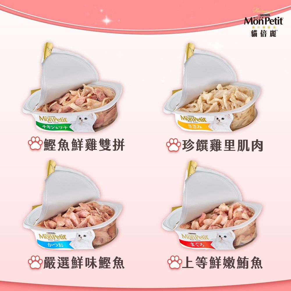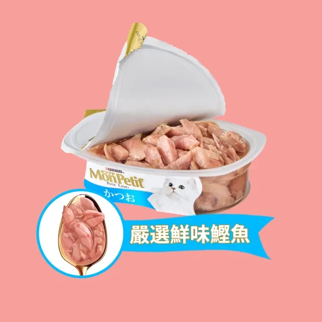 MonPetit 貓倍麗嚴選鮮味鰹魚餐盒,為您的愛貓提供美味又營養的享受。這款濕式貓零食以新鮮鰹魚為主原料,口感滑嫩,搭配濃郁的湯汁,讓貓咪愛不釋手。每盒57克的餐盒設計,方便餵食,適合各年齡階段的貓咪。鰹魚口味不僅美味,還富含蛋白質,有助於維持貓咪的健康活力。給您的愛貓一個奢華的味蕾體驗,讓牠們盡情享受 MonPetit 帶來的美味時光。