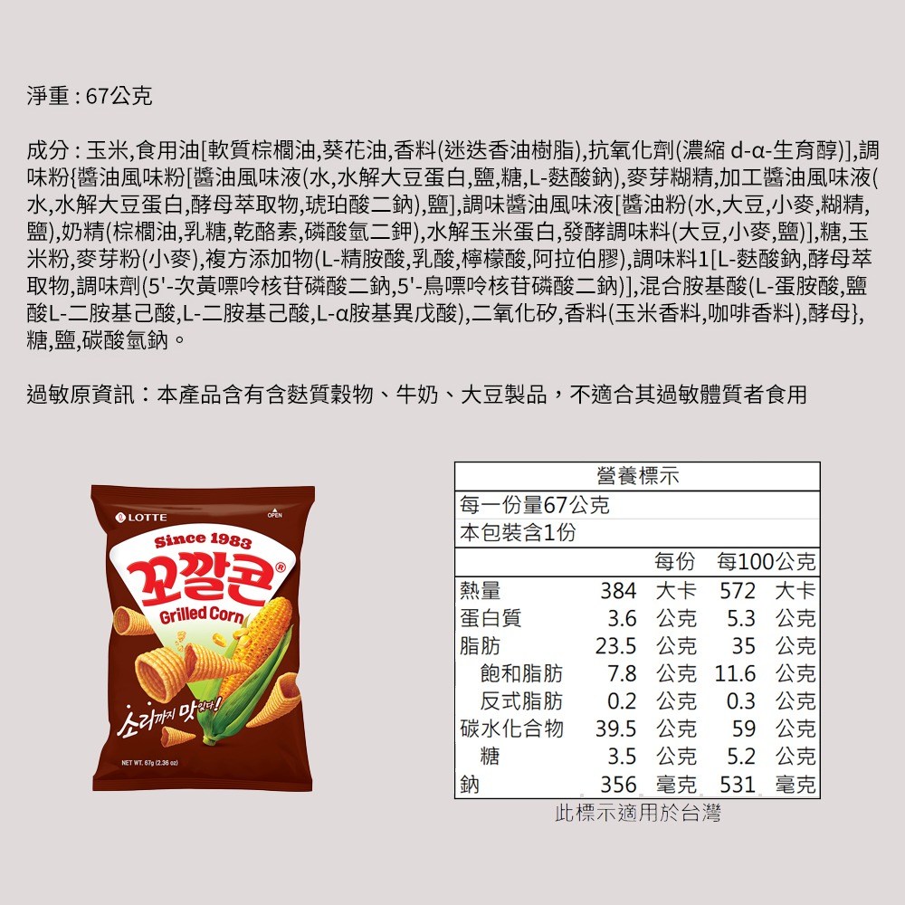 | 成分(牛肉/豬肉需單獨標明來源國) | 玉米,食用油[軟質棕櫚油,葵花油,香料(迷迭香油樹脂),抗氧化劑(濃縮 d-α-生育醇)],調味粉{醬油風味粉[醬油風味液(水,水解大豆蛋白,鹽,糖,L-麩酸鈉),麥芽糊精,加工醬油風味液(水,水解大豆蛋白,酵母萃取物,琥珀酸二鈉),鹽],調味醬油風味液[醬油粉(水,大豆,小麥,糊精,鹽),奶精(棕櫚油,乳糖,乾酪素,磷酸氫二鉀),水解玉米蛋白,發酵調味料(大豆,小麥,鹽)],糖,玉米粉,麥芽粉(小麥),複方添加物(L-精胺酸,乳酸,檸檬酸,阿拉伯膠),調味料1[L-麩酸鈉,酵母萃取物,調味劑(5'-次黃嘌呤核苷磷酸二鈉,5'-鳥嘌呤核苷磷酸二鈉)],混合胺基酸(L-蛋胺酸,鹽酸L-二胺基己酸,L-二胺基己酸,L-α胺基異戊酸),二氧化矽,香料(玉米香料,咖啡香料),酵母},糖,鹽,碳酸氫鈉。 | 製造商或國內負責商名稱 | 請參考實際包裝所示 |