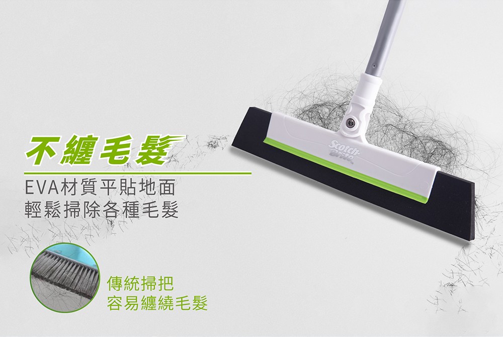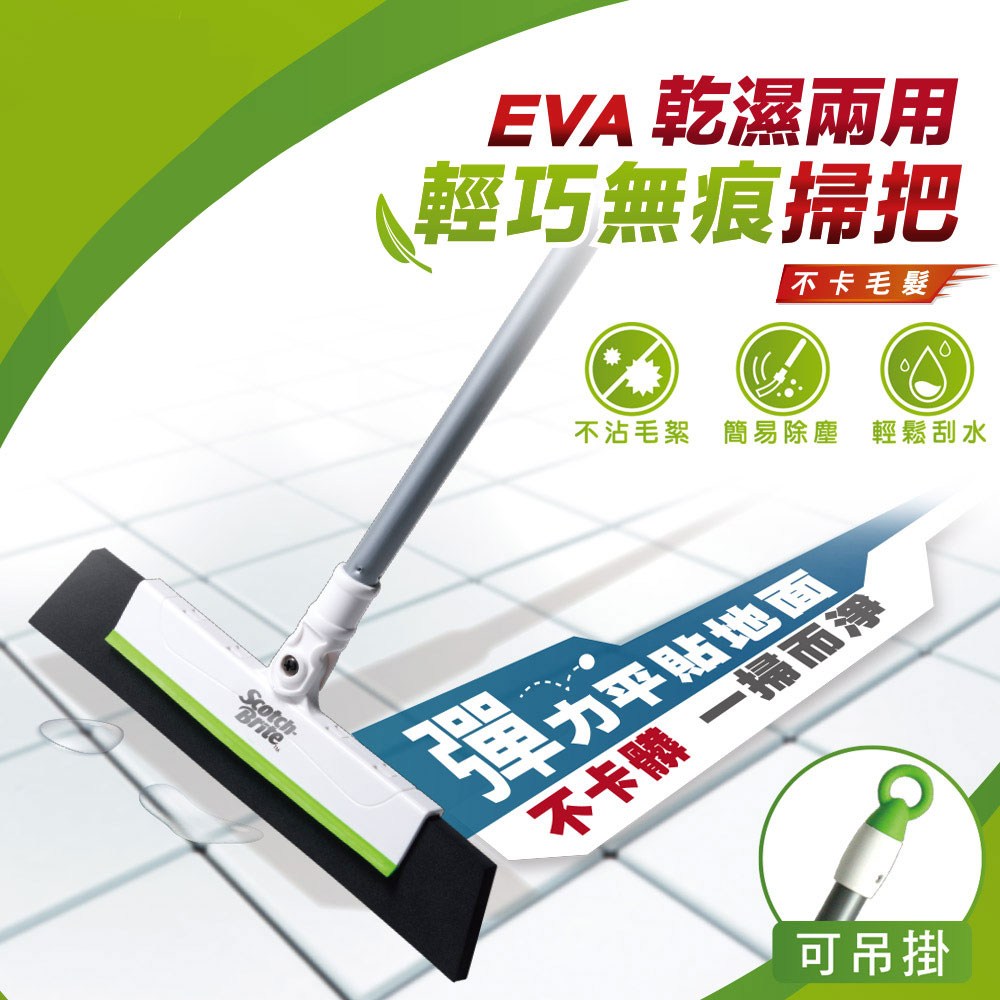 3M Scotch-Brite 百利 EVA輕巧無痕掃把,讓您輕鬆告別惱人的灰塵和毛髮!這款掃把採用EVA材質,能緊密貼合地面,輕鬆刮除各種髒污,不卡毛髮,告別傳統掃把的毛髮纏繞問題。伸縮桿設計,可依需求調整長度,最長可達104.5公分,清潔天花板、牆角等高處也毫不費力。EVA寬度28公分,清掃面積大,省時省力。使用後清水沖洗即可,方便清潔,掛勾設計方便收納,不佔空間,是您居家清潔的好幫手!