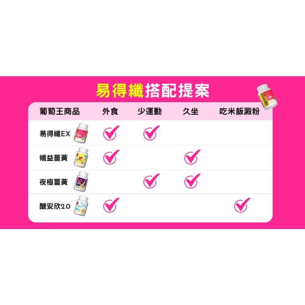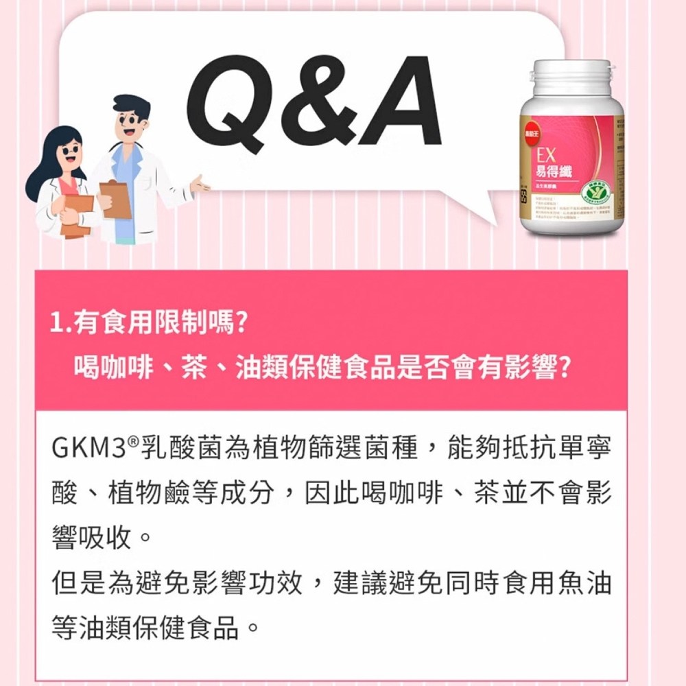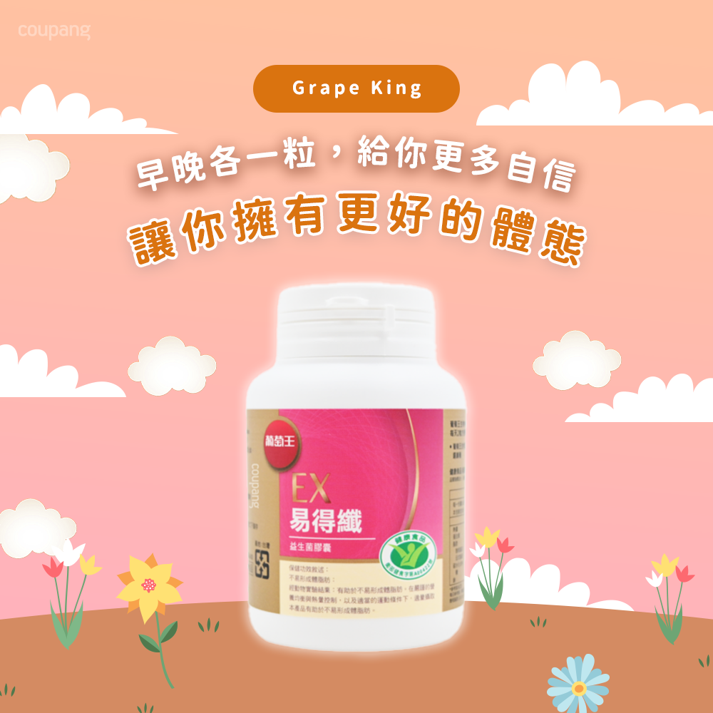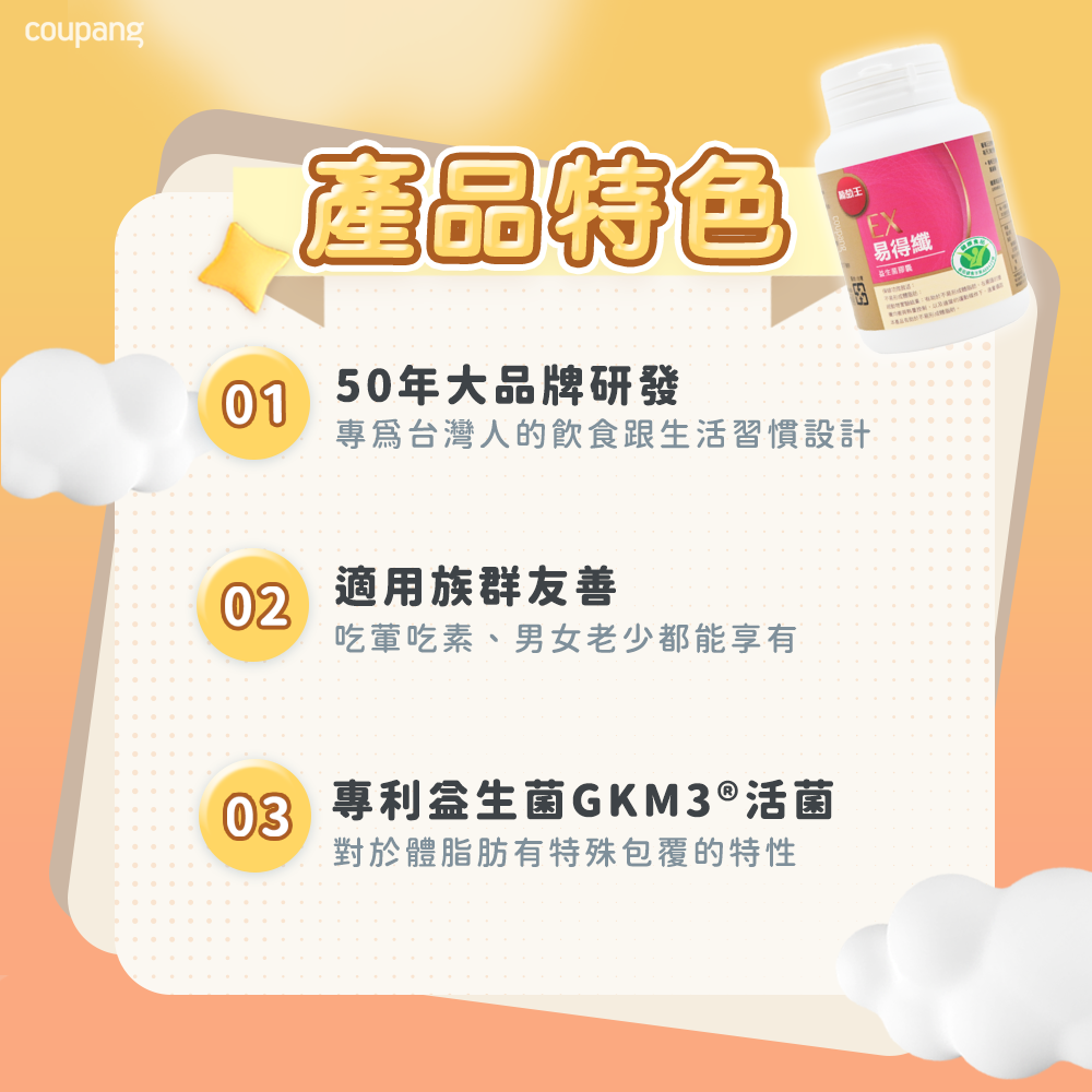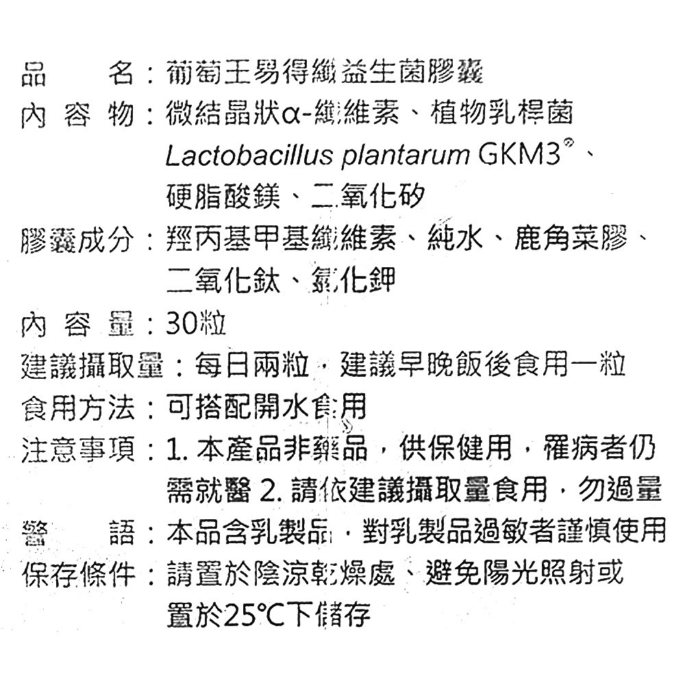 葡萄王易得纖益生菌膠囊,每罐30顆。本產品由50年大品牌葡萄王研發,專為台灣人的飲食跟生活習慣設計,讓您輕鬆享受健康管理。易得纖益生菌膠囊適用於各族群,茹素者、男女老少皆可安心食用。其獨特配方包含專利益生菌GKM3®活菌,有助於維持消化道機能。每日早晚各一顆,搭配開水食用。