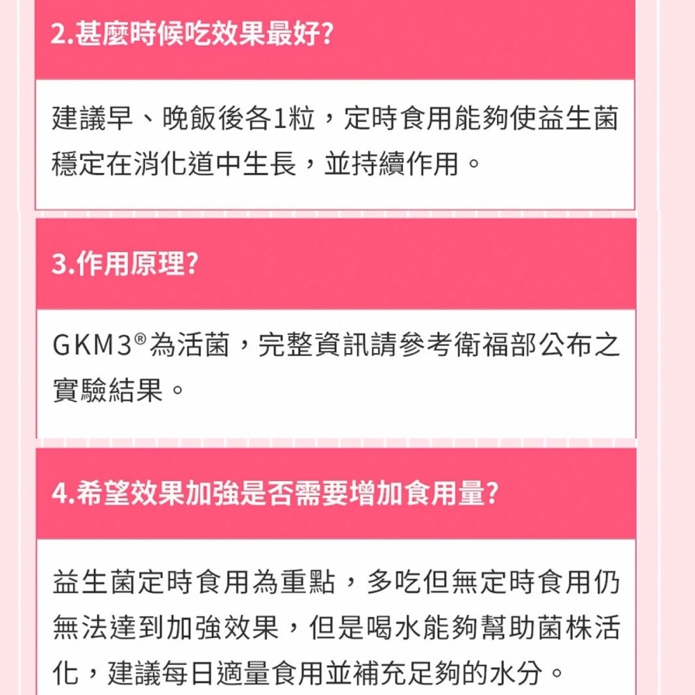 - 內容物: 微結晶α-纖維素、植物乳桿菌 Lactobacillus plantarum GKM3、硬脂酸鎂、二氧化矽