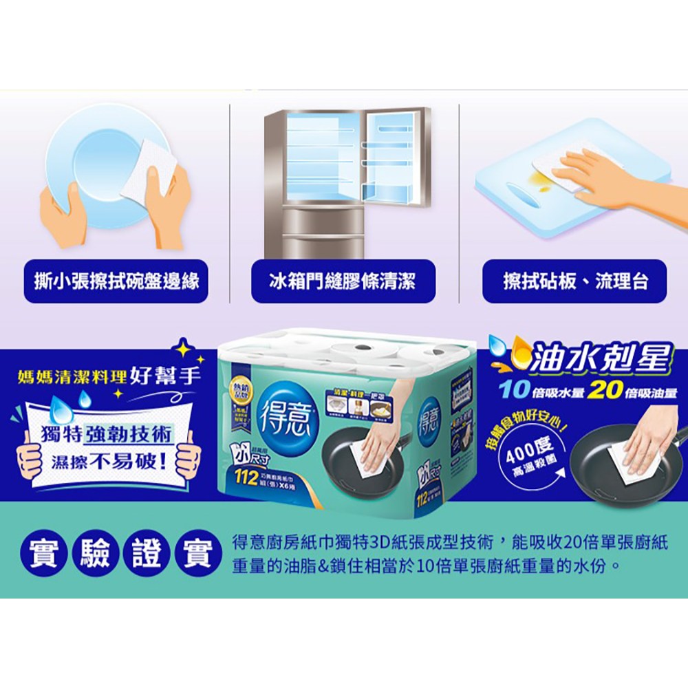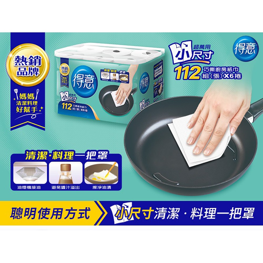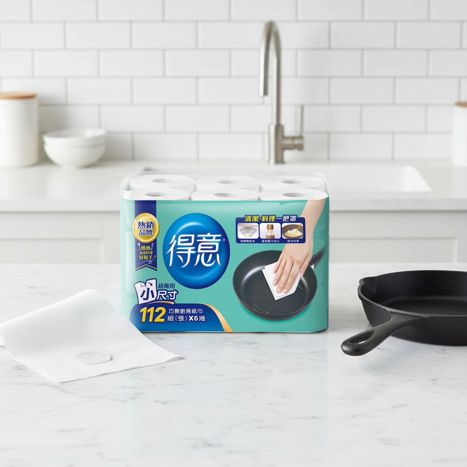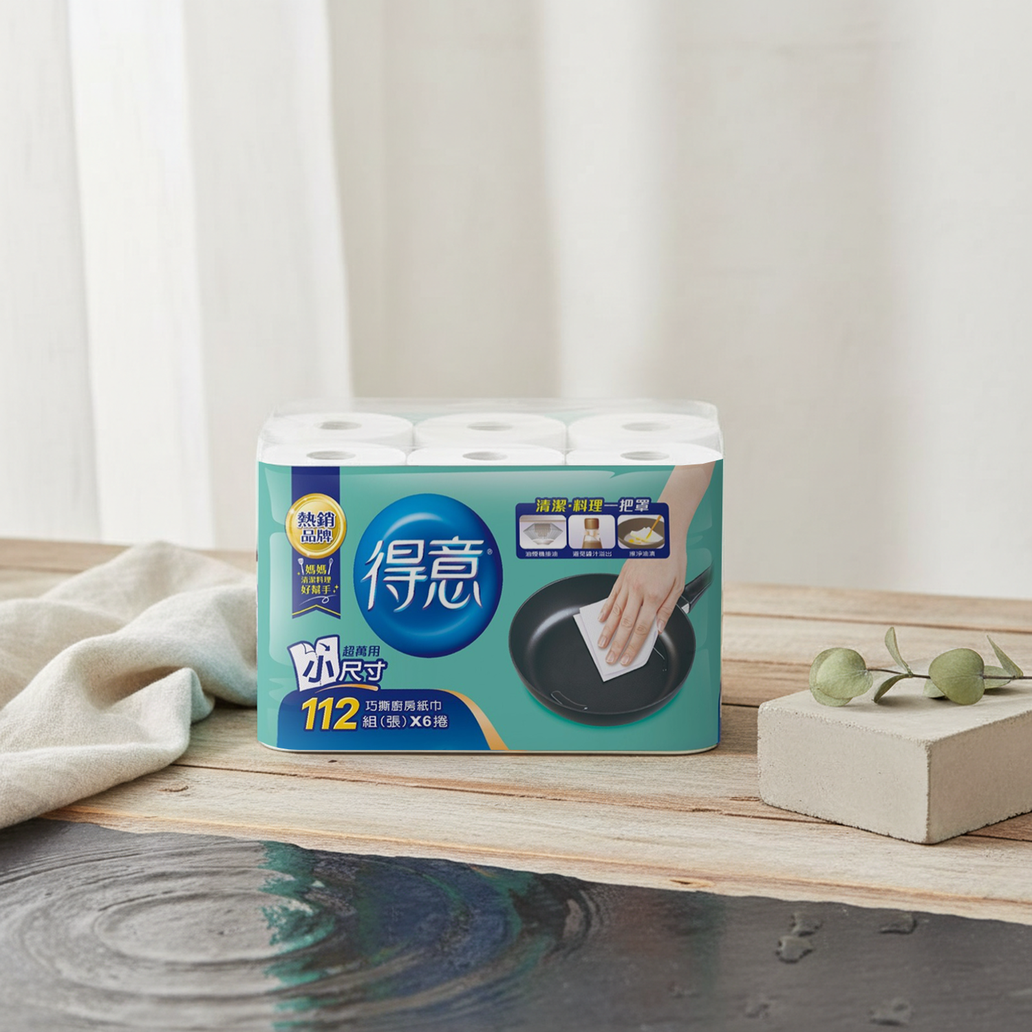 得意金得意系列巧撕廚房紙巾,是您廚房清潔的好幫手。每包含有6捲紙巾,每捲112張,雙層設計,吸水力強,讓您輕鬆擦拭油污、水漬。本產品無螢光劑,使用更安心。獨特巧撕設計,方便抽取,不浪費。無論是擦拭爐具、料理台,還是吸取多餘油份,得意廚房紙巾都能滿足您的需求,讓您的廚房隨時保持乾淨整潔。