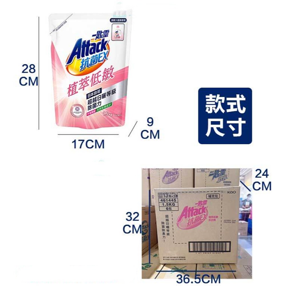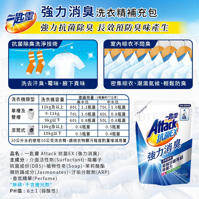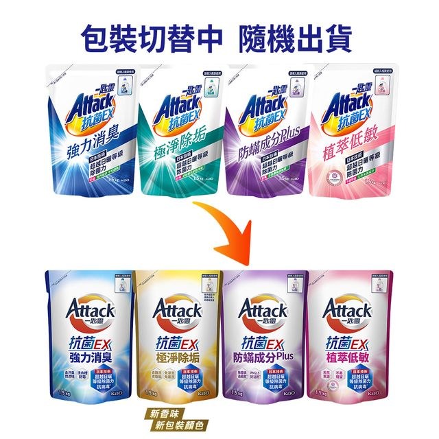 告別惱人的汗臭、霉味和污漬,讓衣物散發清新氣息![DS][箱裝] Attack 一匙靈 抗菌EX洗衣精 補充包,採用日本抗菌EX技術,能深入纖維,徹底去除細菌和異味,即使在室內晾曬也能保持乾爽無異味。此補充包包含6包1.5kg的洗衣精,經濟實惠,適合家庭使用。一匙靈洗衣精不僅能有效抗菌除臭,還能溫和洗淨衣物,不傷衣料,讓您的衣物潔淨如新。選擇Attack 一匙靈,給家人最安心的保護,享受陽光般的潔淨體驗!