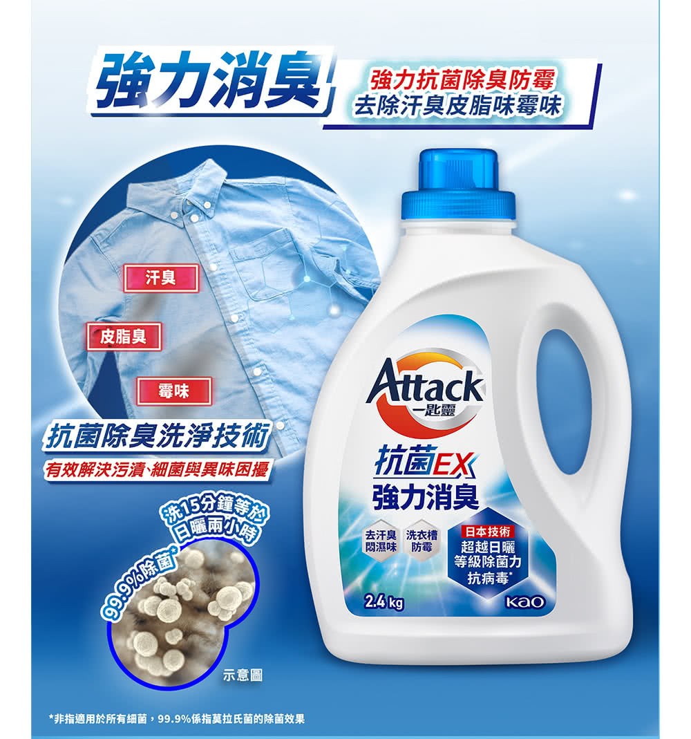 - 一匙靈抗菌EX洗衣精,深入纖維去除頑固污漬,讓衣物恢復潔淨,散發清新氣息。