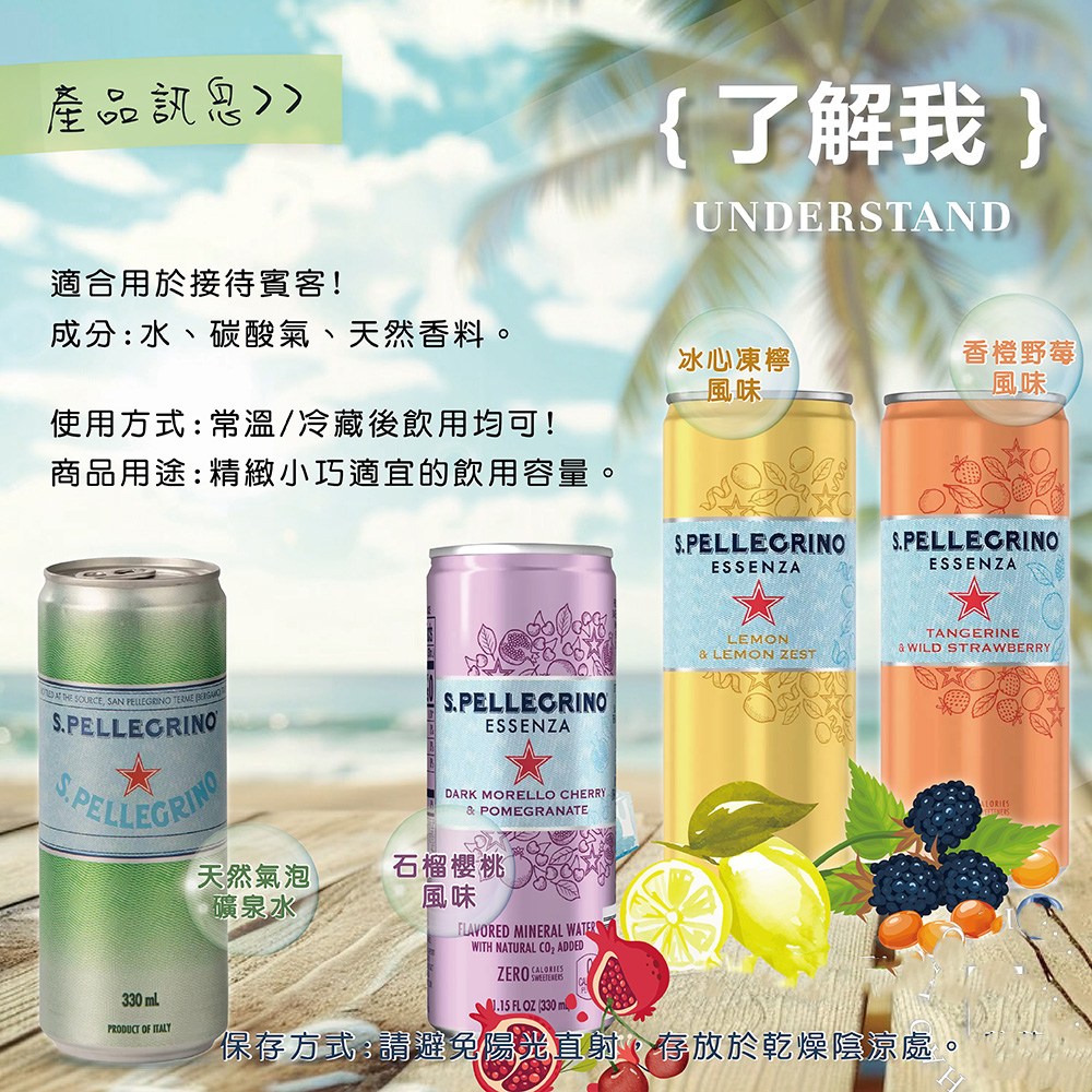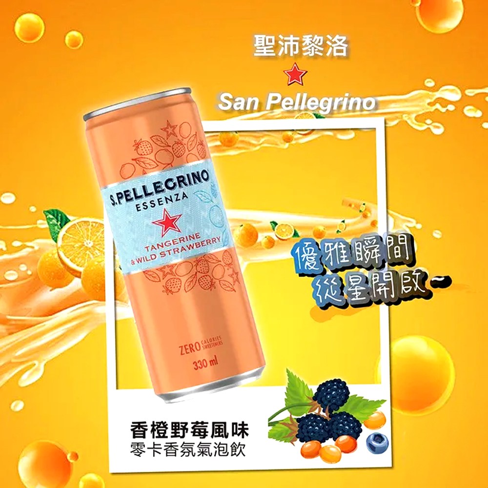 - 聖沛黎洛氣泡飲,香橙野莓風味,口感細緻,氣泡綿密,帶來清爽暢快的味蕾享受。