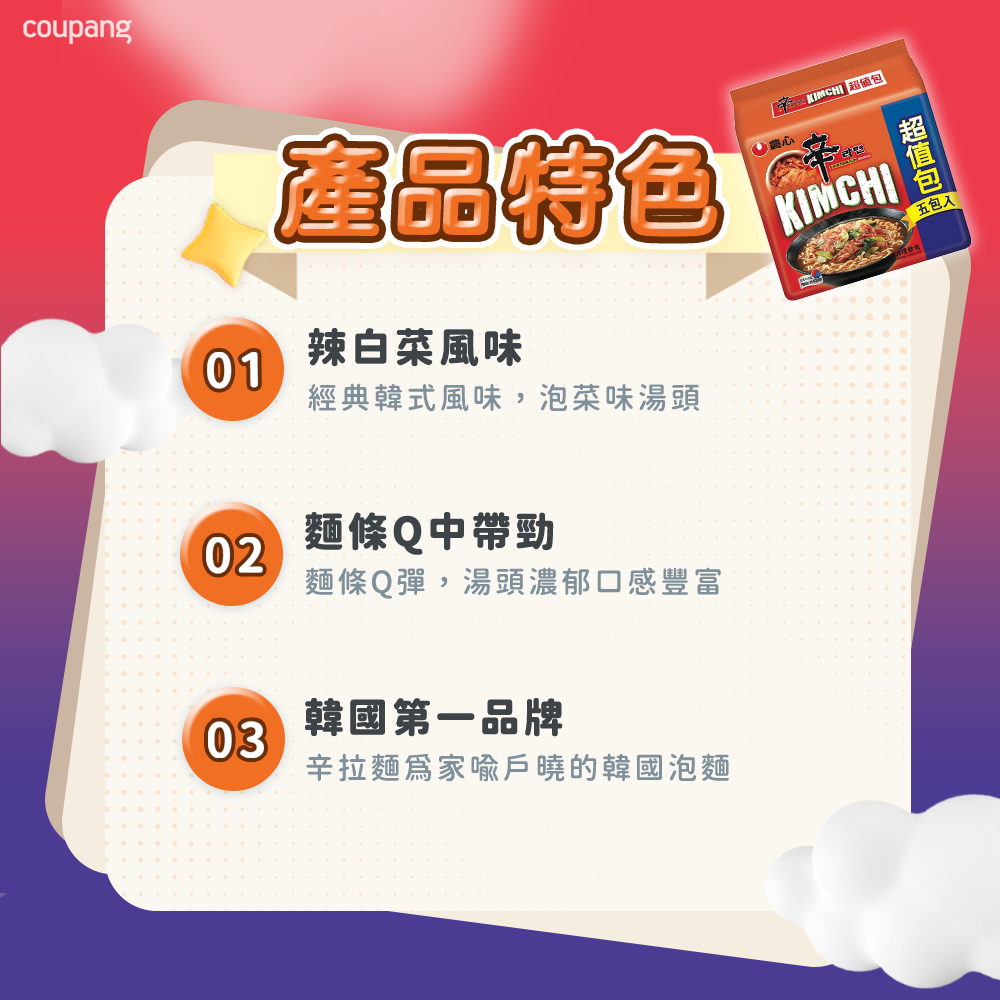 - 農心辛拉麵,辣白菜風味湯頭濃郁,口感豐富,讓您在家也能輕鬆享受道地韓式風味。