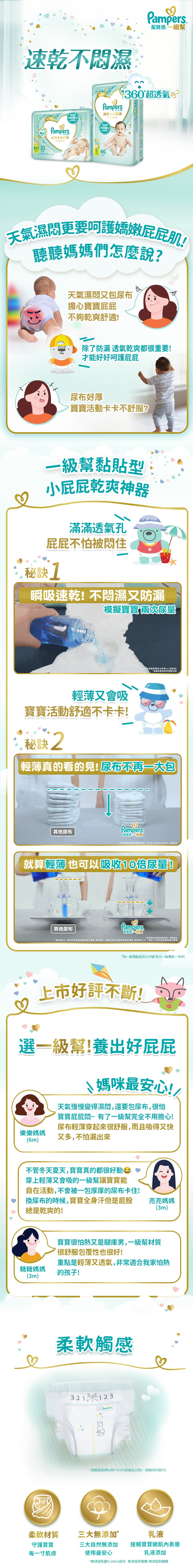 - 360度透氣設計,迅速排出濕氣,讓寶寶屁屁保持乾爽舒適,有效減少紅屁屁發生,讓寶寶隨時保持最佳狀態。