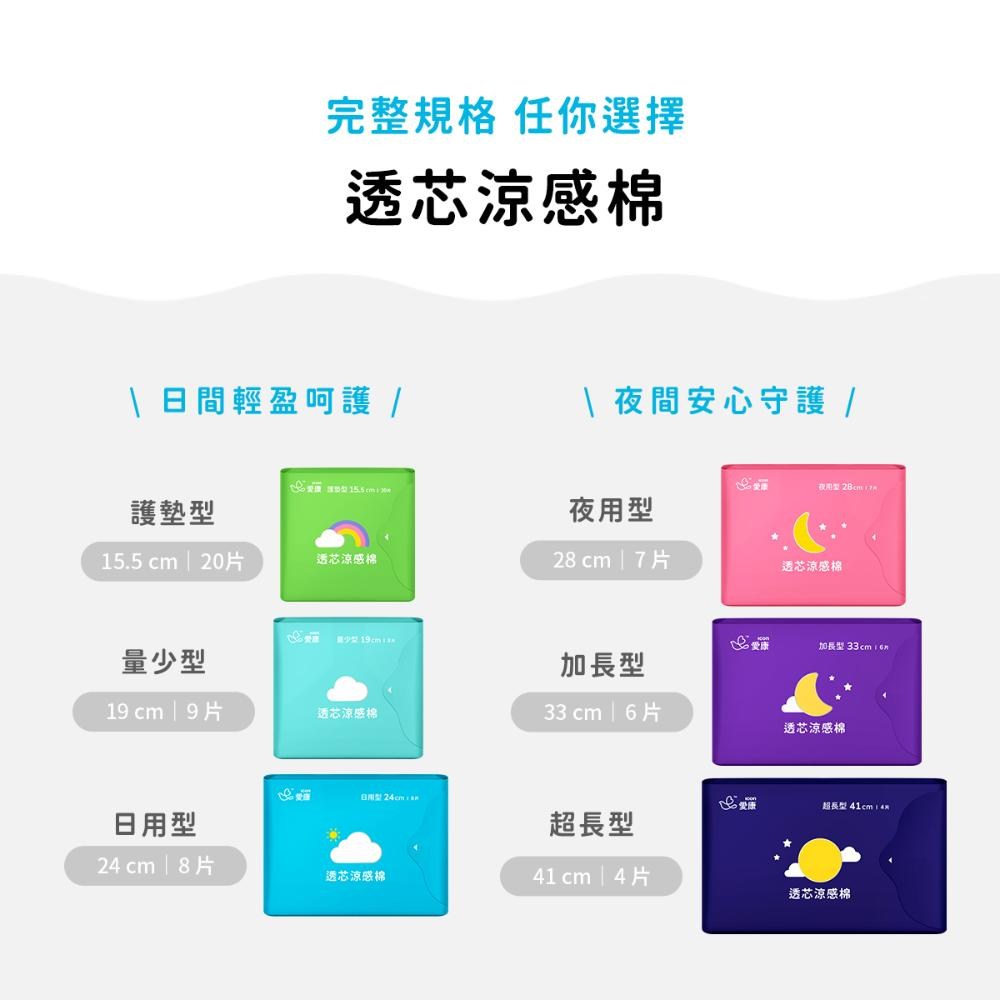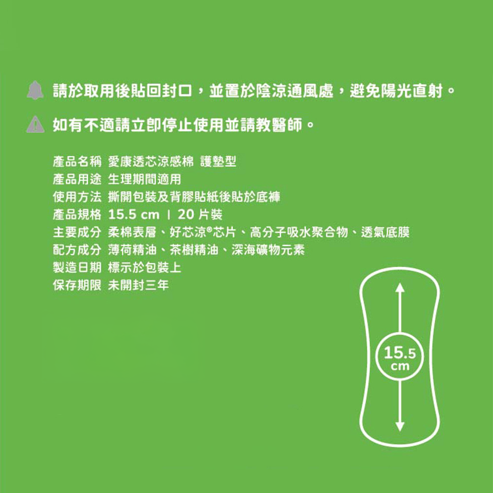 - 愛康涼感護墊給您清新體驗,獨特涼感配方,舒緩悶熱不適,讓您隨時感受清爽舒適。