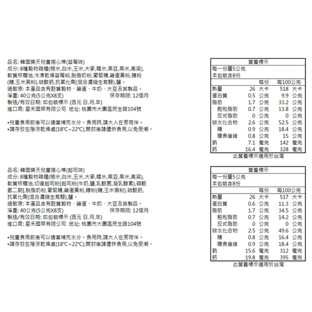 | 投保產品責任險字號 | 07字第062214A00204號 | 成分 | 8種穀物雜糧(糙米,白米,玉米,大麥,糯米,黑豆,黑米,高粱),軟質棕櫚油,冷凍乾燥草莓粉,脫脂奶粉,葡萄糖,雞蛋黃粉,糖粉(糖,玉米澱粉),碳酸鈣,抗氧化劑(混合濃縮生育醇),鹽。 |