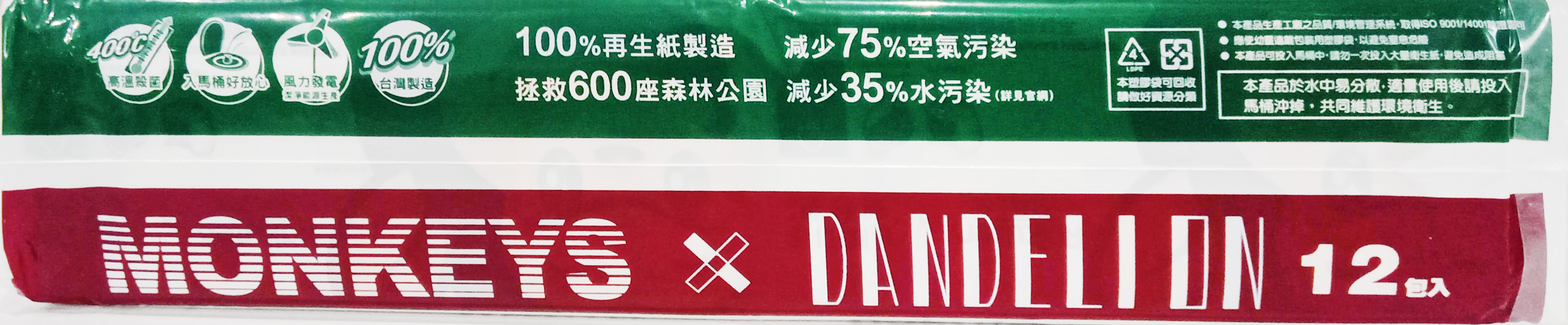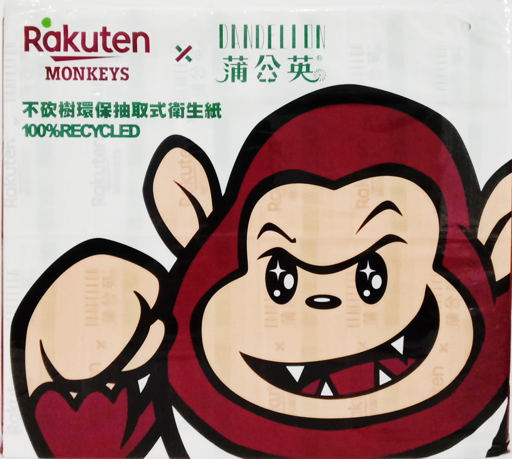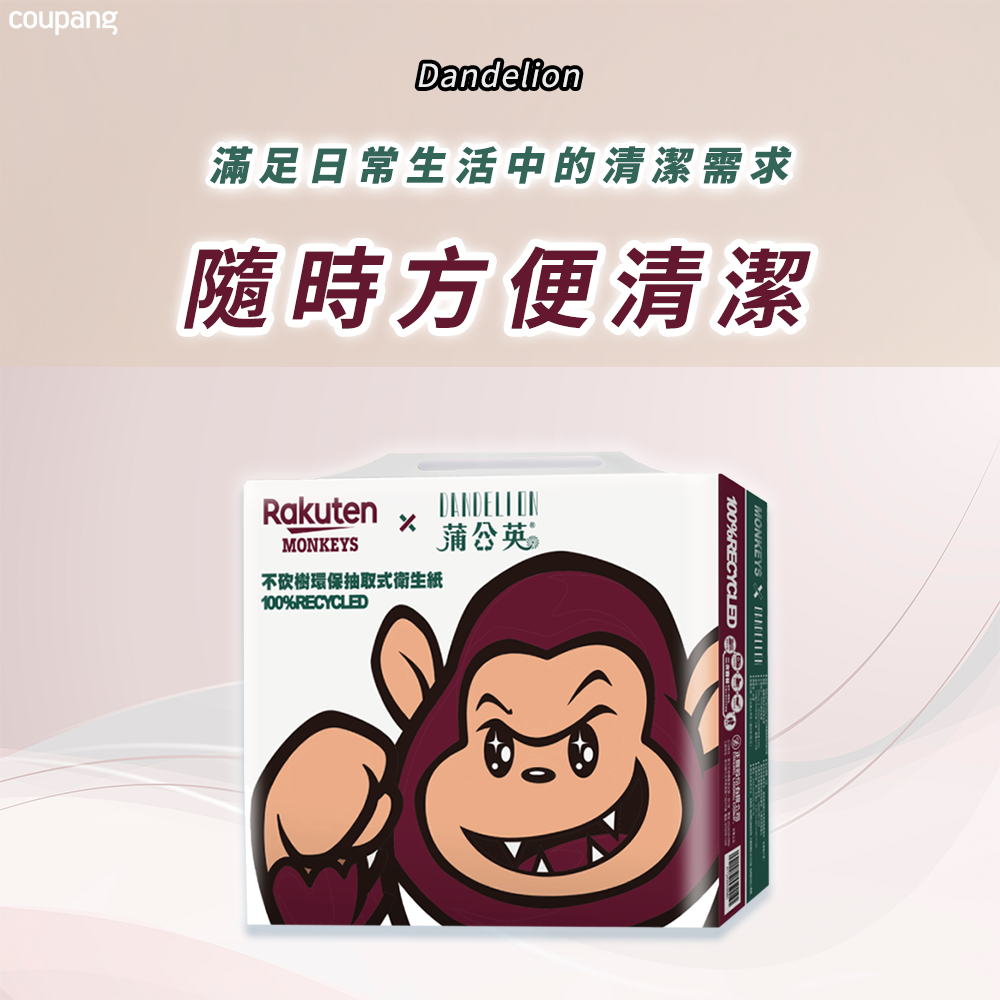 - 蒲公英與樂天桃猿聯名設計,可愛猩猩圖案,讓抽取衛生紙也充滿樂趣,為生活增添更多色彩。