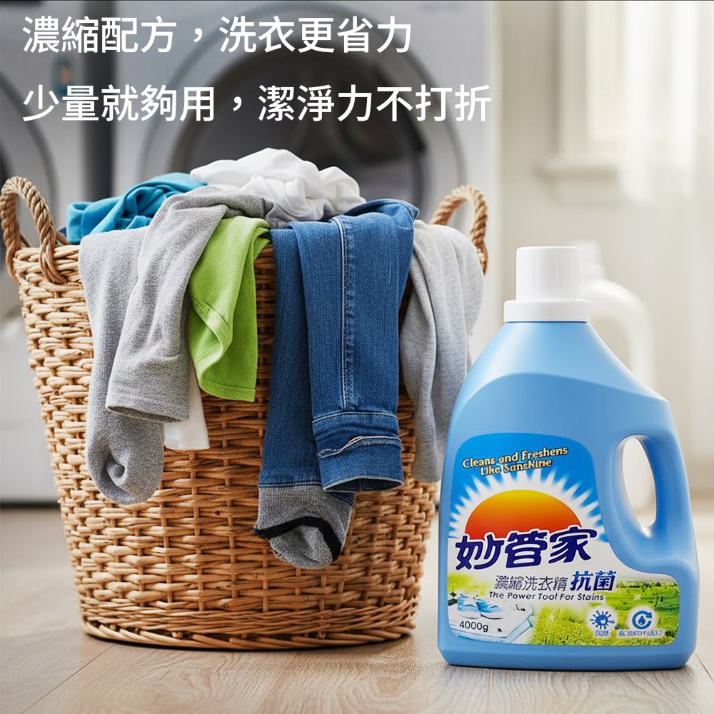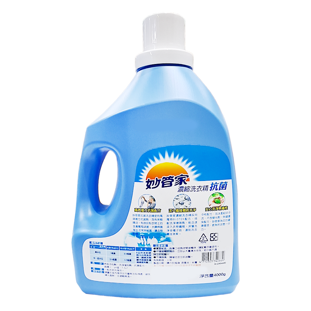 妙管家濃縮抗菌洗衣精,箱裝4公斤x4桶,是您洗衣的最佳選擇。本產品採用濃縮配方,用量更省,能深入纖維,徹底去除污漬,讓衣物潔淨如新。強效抗菌配方,有效抑制金黃色葡萄球菌、大腸桿菌等常見細菌,保護您和家人的健康。中性配方溫和不刺激,不傷衣物纖維,讓衣物保持柔軟舒適。經SGS檢驗證明,不含螢光劑、無磷酸鹽、無鹼性物質,安全可靠,讓您安心使用。現在購買,即可享有超值優惠,千萬會員信賴的選擇,讓您輕鬆擁有潔淨、健康的生活。