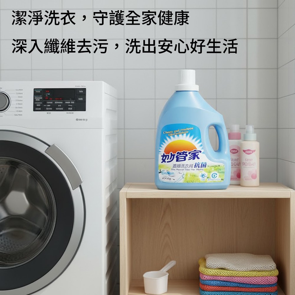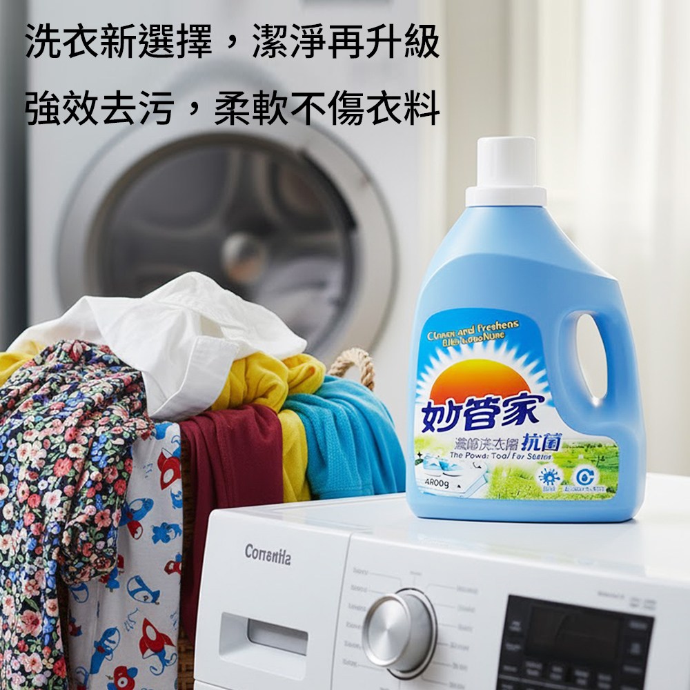 - 妙管家洗衣精深層潔淨,輕鬆去除頑固污漬,讓衣物煥然一新,散發清新氣息。