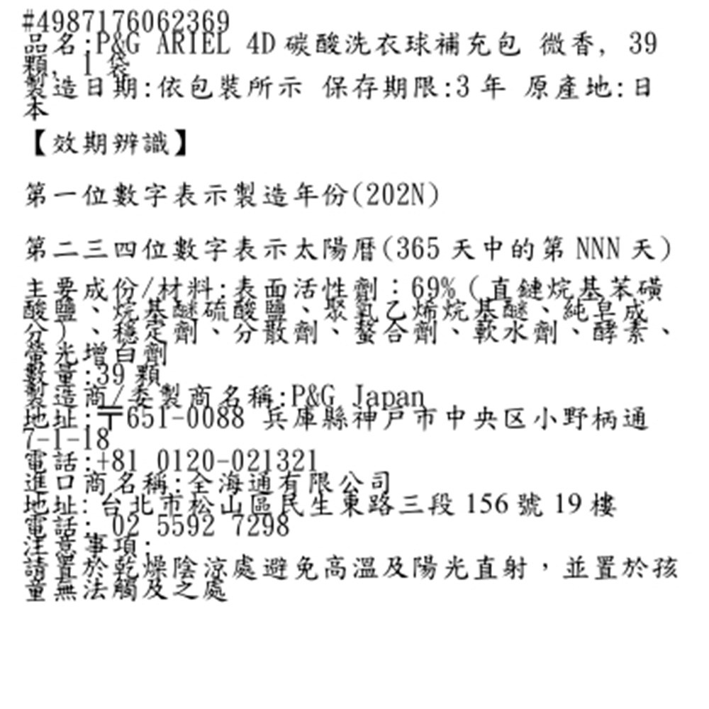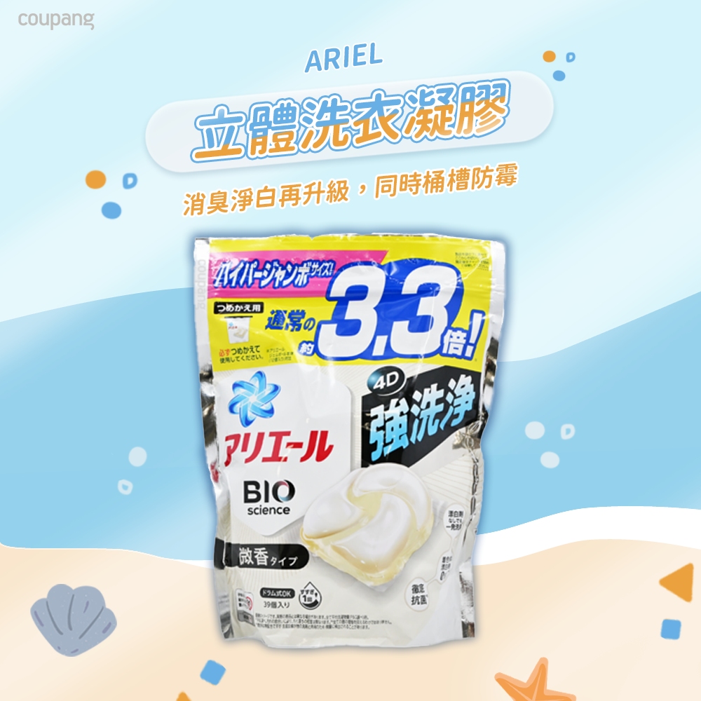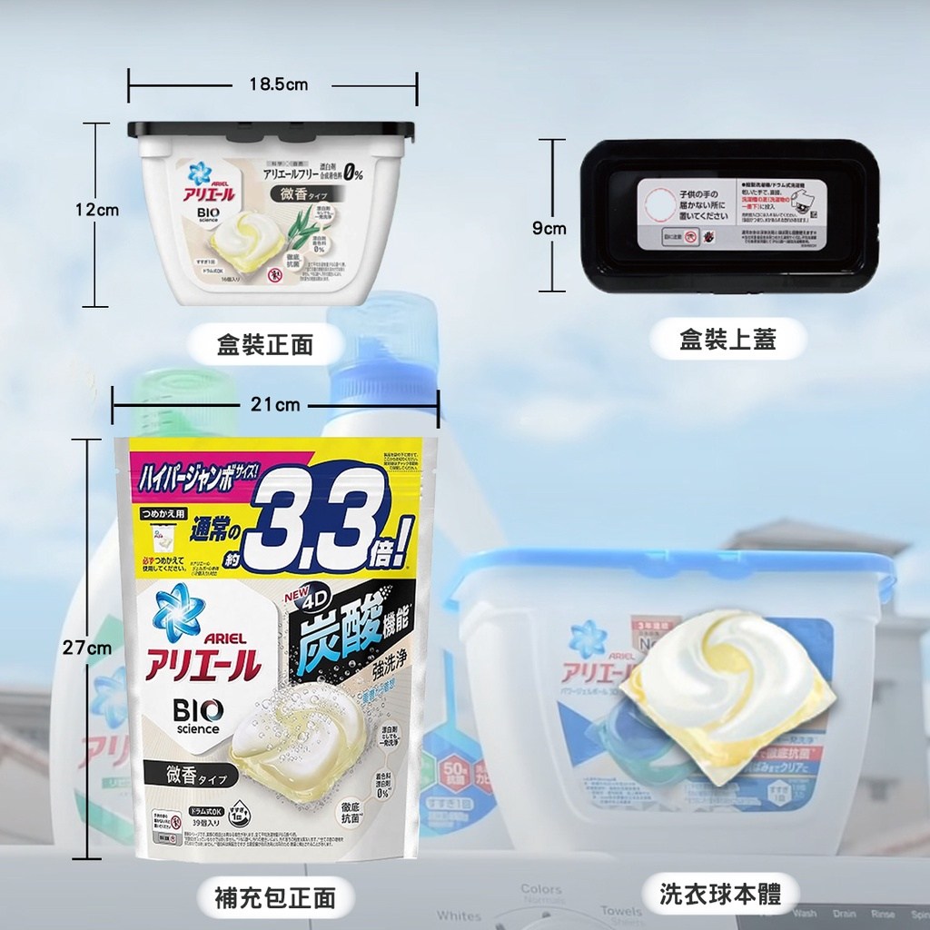 日本販售同款,全新升級P&G ARIEL 4D碳酸洗衣球補充包,微香型,一袋39顆入,是您洗衣的理想選擇。獨特4D碳酸技術,深入纖維,強力清潔頑固污漬,讓衣物煥然一新。微香配方,洗後散發淡淡清香,告別異味困擾。洗衣球遇水即溶,不沾手,使用方便快捷,一顆即可輕鬆洗淨6公斤衣物。補充包設計,是您居家洗衣的明智之選。