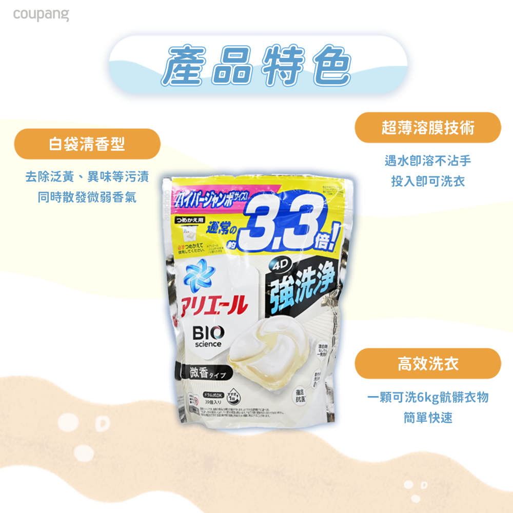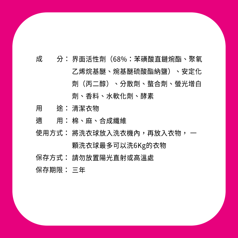- 微香型洗衣球,洗後衣物散發淡淡清香,溫和不刺鼻,給您舒適的穿著體驗。