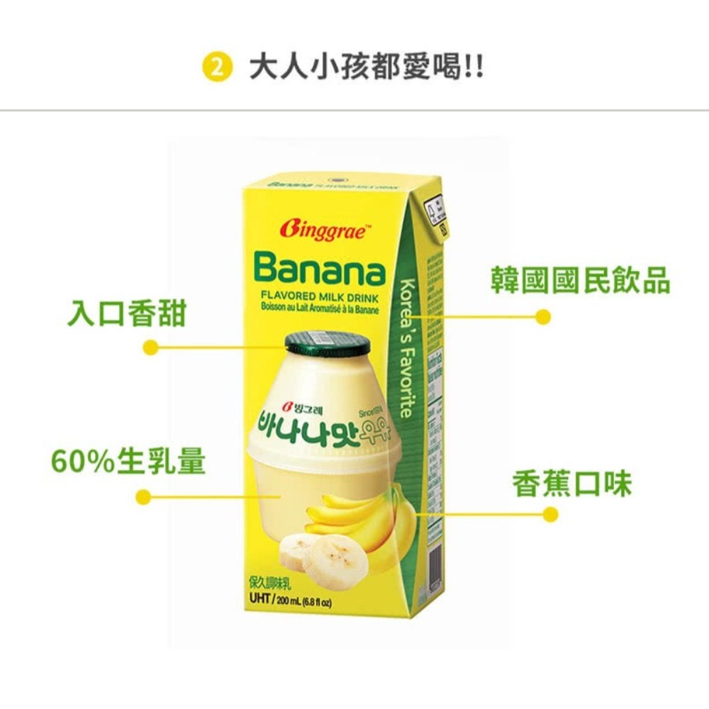 品嚐韓國國民飲料Binggrae香蕉牛奶,原裝進口,口感香甜,大人小孩都喜愛!每箱包含24入200ml的香蕉牛奶,採用60%生乳量,營養豐富,隨時隨地都能享受美味。UHT滅菌處理,常溫保存,方便攜帶。無論是早餐、下午茶或點心,都是最佳選擇,讓您隨時補充能量,享受幸福滋味。