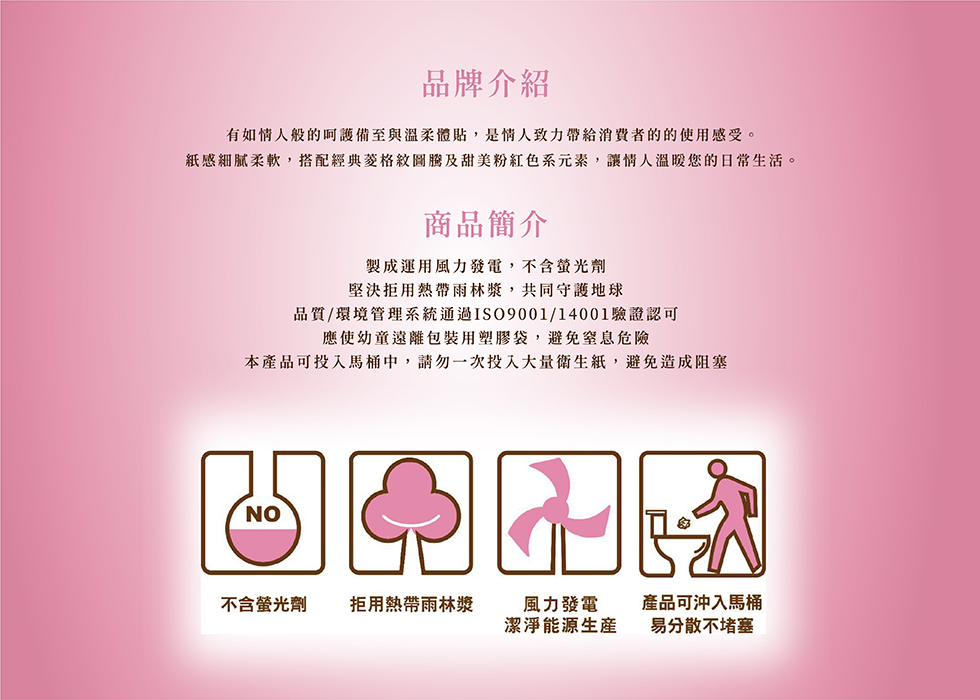 - 情人衛生紙,觸感細緻柔軟,給您如情人般的呵護,溫柔呵護您的肌膚。