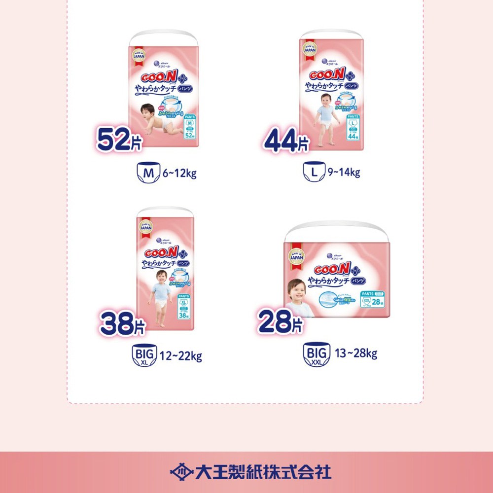 GOO.N 大王日本境內版褲型尿布,給寶寶帶來極致舒適體驗。此款XL尺寸褲型尿布,一箱114片裝,適合12-22公斤的寶寶,男女寶寶皆適用。日本境內版品質保證,觸感柔軟,呵護寶寶嬌嫩肌膚,讓寶寶活動自如,舒適一整天。採用透氣材質,讓寶寶隨時保持乾爽舒適。貼心設計,易於穿脫,方便媽媽更換,給寶寶帶來全方位的呵護。