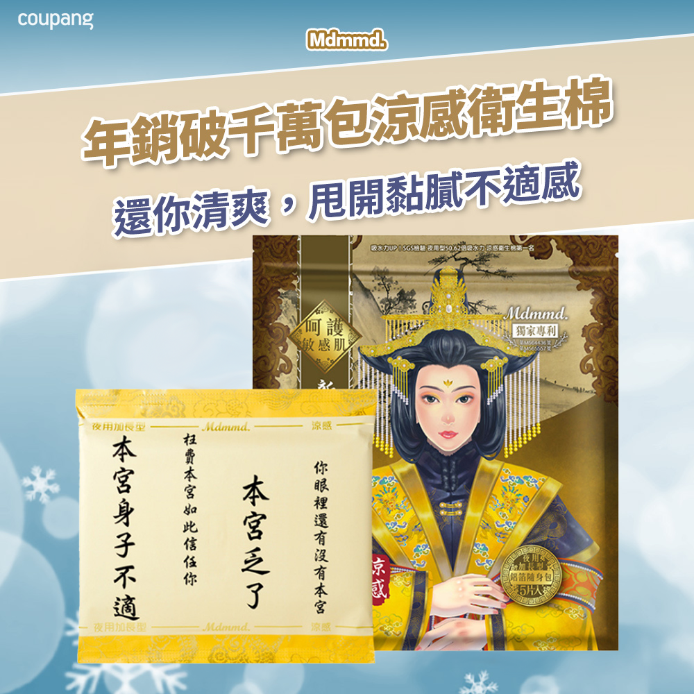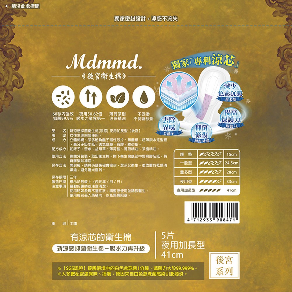Mdmmd. 明洞國際 新涼感抑菌衛生棉,後宮系列,給您帶來前所未有的清爽體驗。這款夜用加長型衛生棉,長達41公分,讓您告別悶熱和不適。獨特涼感配方,有效舒緩悶熱感,讓您在特殊時期也能保持舒適自在。立體棉網材質,柔軟親膚,給您帶來極致的呵護。此外,讓您使用更安心。