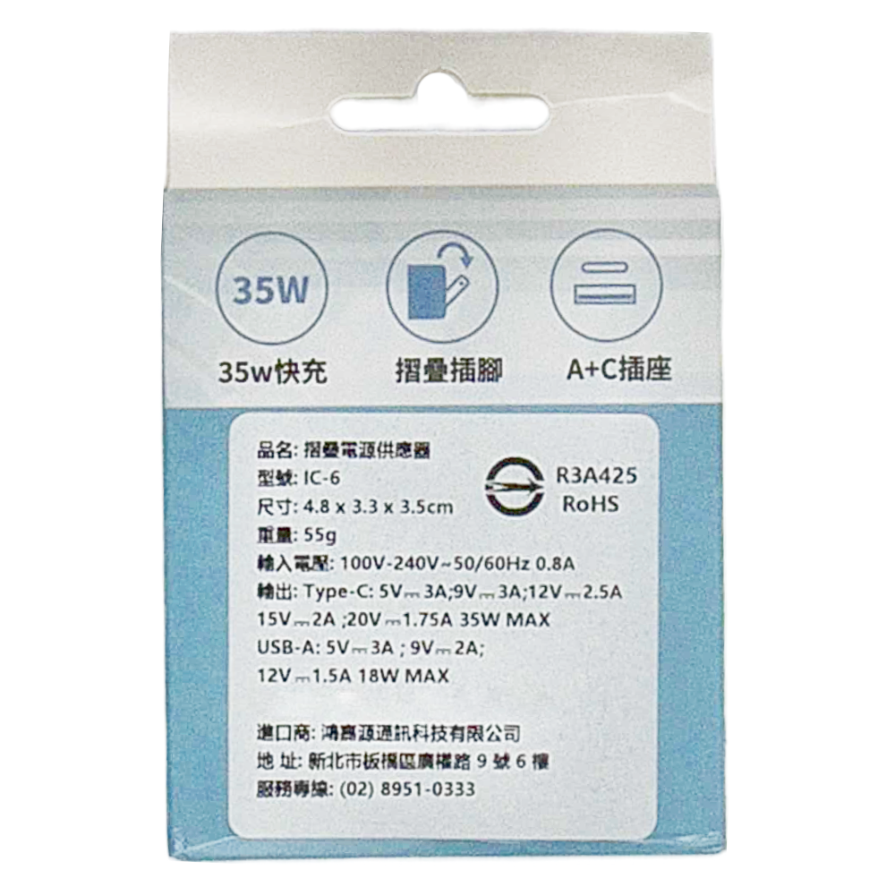 這款IC-6白色35W摺疊電源供應器,採用GaN氮化鎵技術,體積小巧,重量僅55g,方便攜帶。它支援PD+QC快充協議,Type-C接口最高可達35W輸出,USB-A接口最高可達18W輸出,可同時為兩台設備充電,節省您的時間。摺疊式插腳設計,讓您輕鬆收納,不佔空間,具備多重安全保護機制,如防摔、防短路、防爆、耐熱、防靜電、過電流保護等,讓您安心使用。適用於100-240V電壓,全球通用,是您旅行出差的理想選擇。