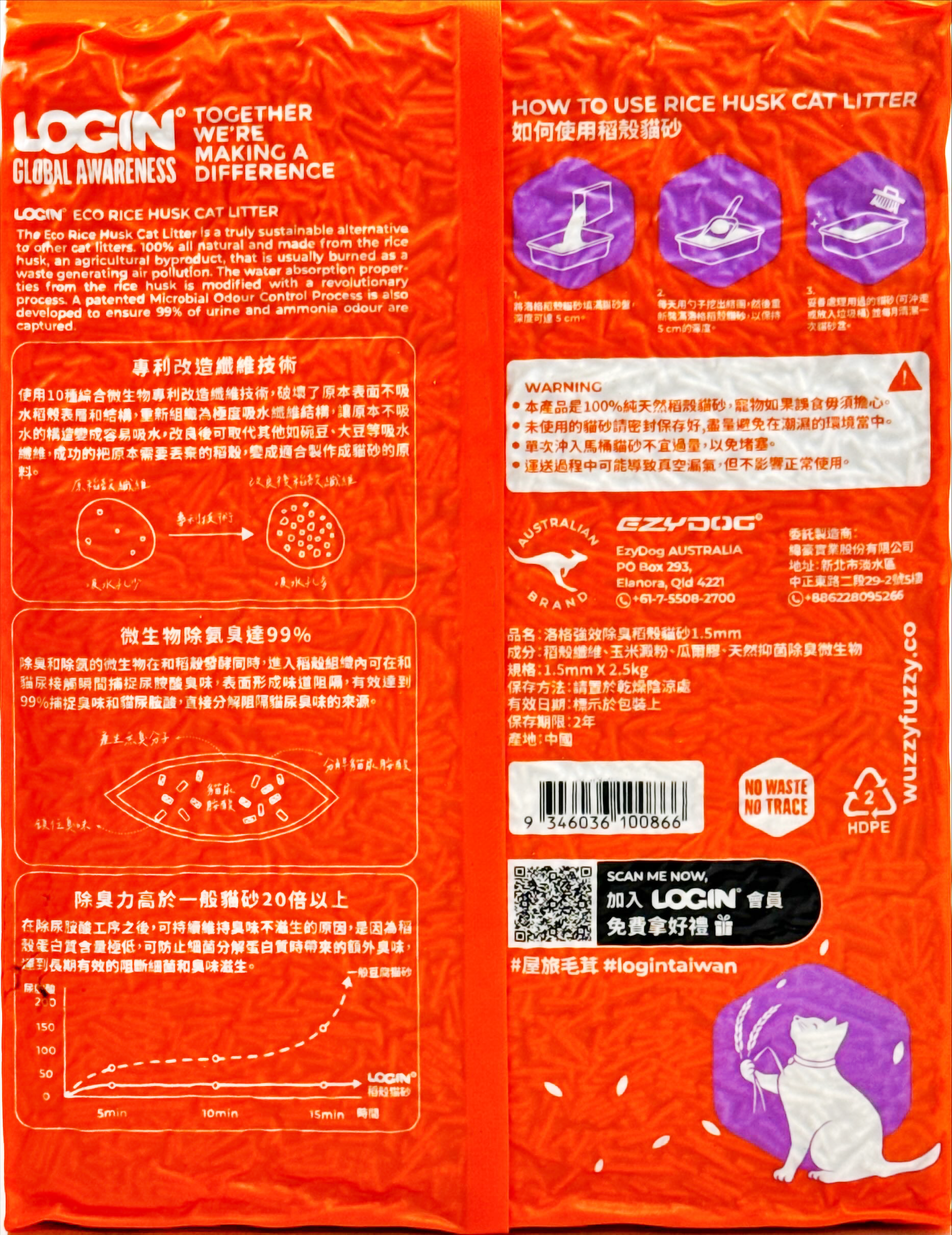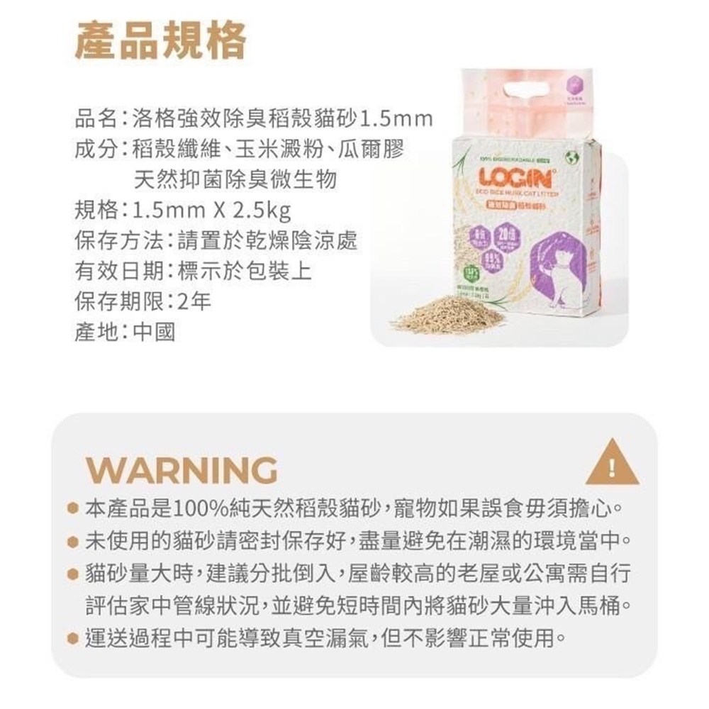 LOGIN 澳洲洛格強效除臭稻殼貓砂,是對環境友善且可持續的選擇。1.5mm的細小顆粒能迅速吸收水分,結團效果是一般貓砂的20倍,有效控制異味,讓您的居家環境保持清新。此款貓砂除臭力高達99%,無添加香精,適合對氣味敏感的貓咪。2.5kg的包裝方便使用,可沖馬桶設計更方便清理。選擇LOGIN稻殼貓砂,給您的愛貓一個乾淨舒適的如廁環境。