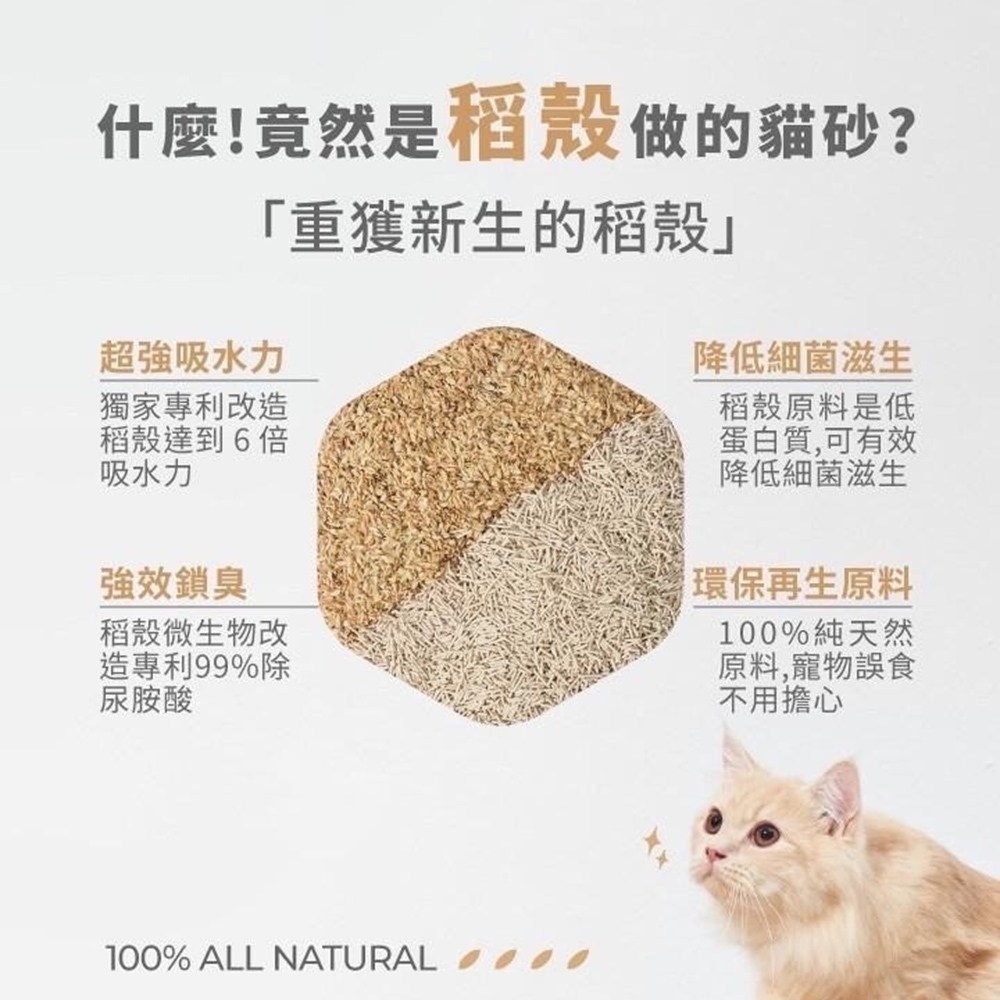 - 稻殼材質輕巧易清理,讓您輕鬆維持貓砂盆的清潔,告別沉重負擔。
