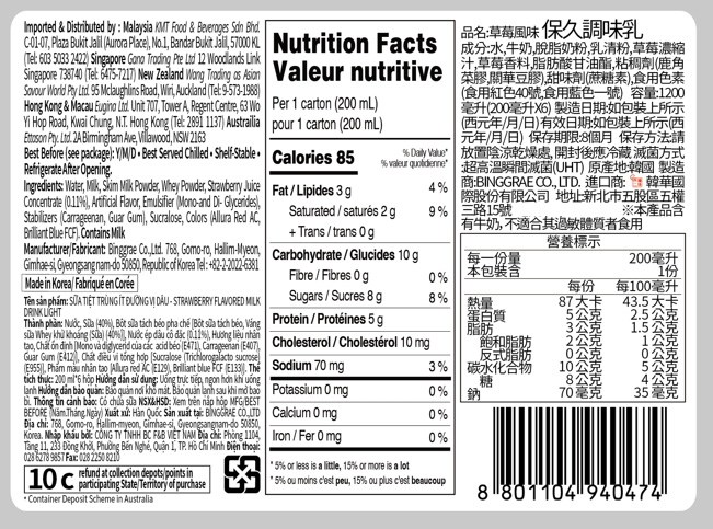 - - 方便攜帶的200ml包裝,隨時隨地享受Binggrae草莓風味調味乳。