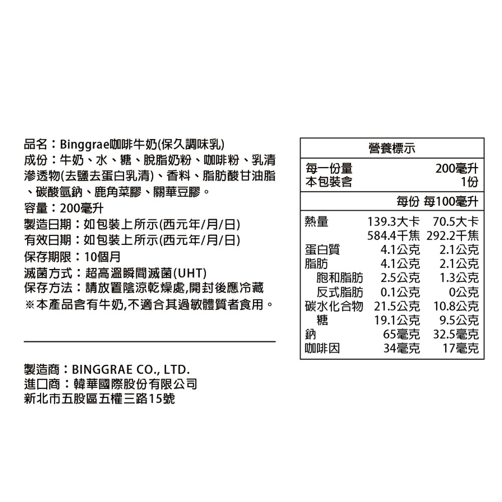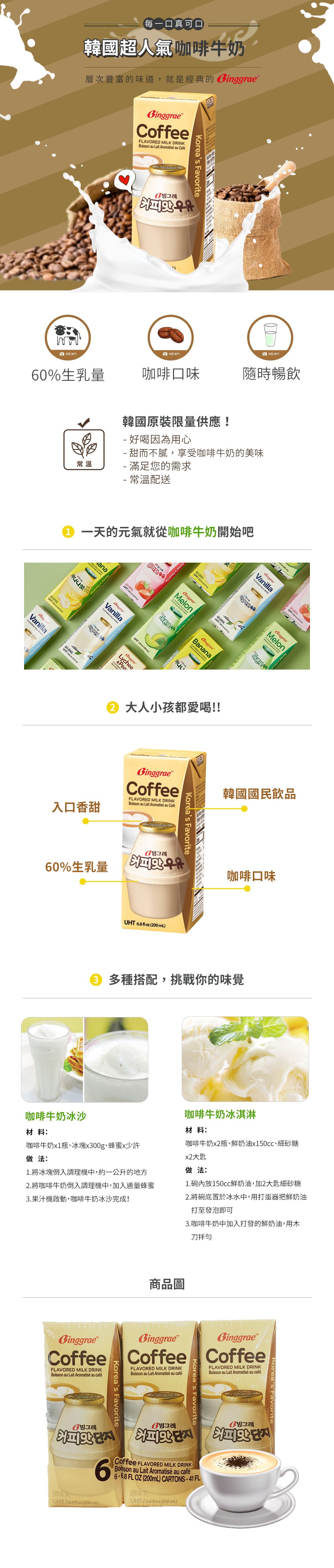 品嚐韓國人氣咖啡牛奶!BINGGRAE 咖啡牛奶,每組包含六瓶200毫升的美味咖啡牛奶,讓您隨時享受濃郁香醇的咖啡風味。採用高溫滅菌技術,確保牛奶的新鮮與安全,讓您安心飲用。無論是早餐、下午茶或點心,都是您補充能量的最佳選擇。口感滑順,咖啡與牛奶完美融合,給您帶來愉悅的味蕾體驗。快來體驗這款韓國經典咖啡牛奶,感受道地的韓國風味!