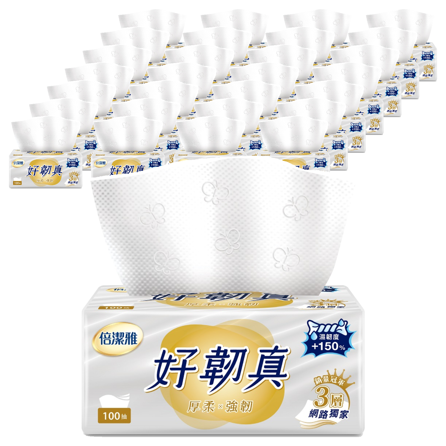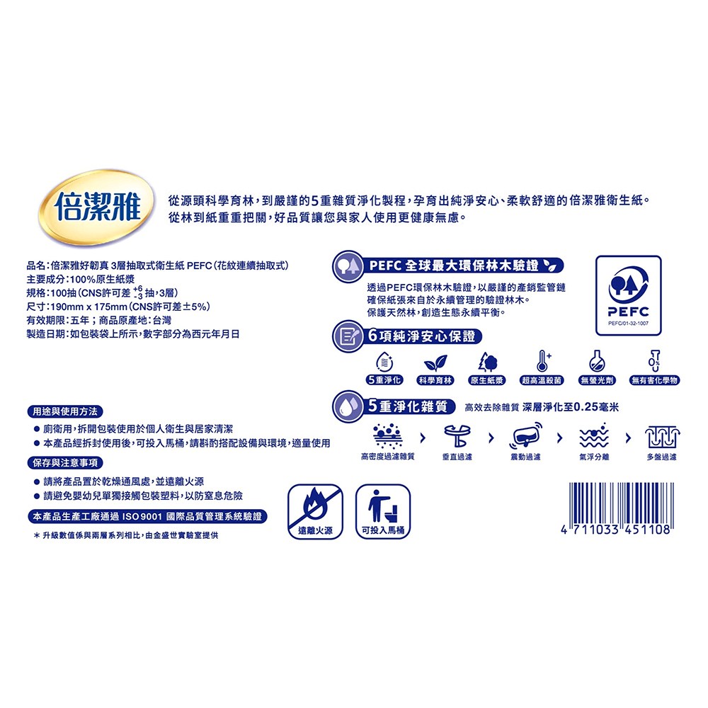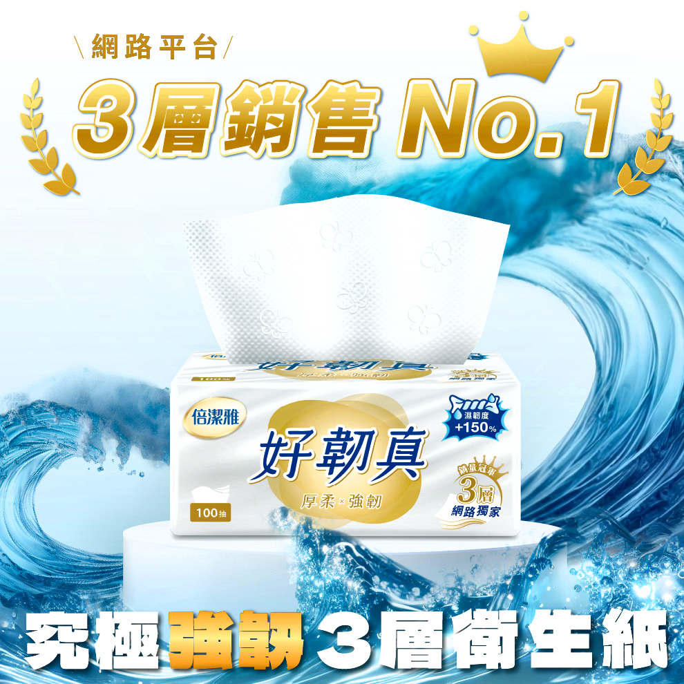 倍潔雅好韌真抽取式衛生紙,給您帶來厚實、柔軟又強韌的全新體驗。每包含有100張三層衛生紙,一箱共12包,滿足您長時間的使用需求。採用PEFC認證的紙漿,不含螢光劑及有害化學物質,給您和家人安心的呵護。獨家蝶壓壓花工藝,讓紙張觸感更細緻,使用起來更加舒適。無論是居家清潔、擦拭汗水或呵護肌膚,倍潔雅好韌真都能給您最溫柔的呵護。