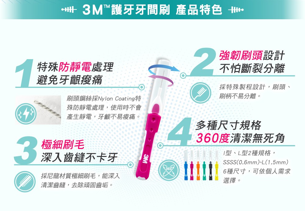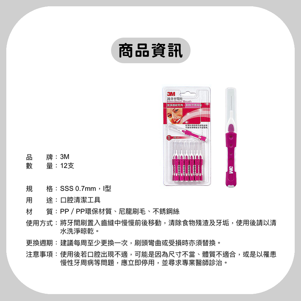 3M 護牙牙間刷I型12入(SSS)是您維持口腔健康的理想選擇。這款牙間刷採用高品質不鏽鋼絲和柔軟尼龍刷毛製成,能有效清潔牙縫間的食物殘渣和牙菌斑。SSS(0.7mm)的刷毛粗細適合牙縫較小的人士使用,I型設計方便清潔前牙區域。每組包含12支牙間刷,經濟實惠,適合全家使用。3M是值得信賴的口腔護理品牌,讓您安心使用,展現自信笑容。建議每週更換一次,確保清潔效果。